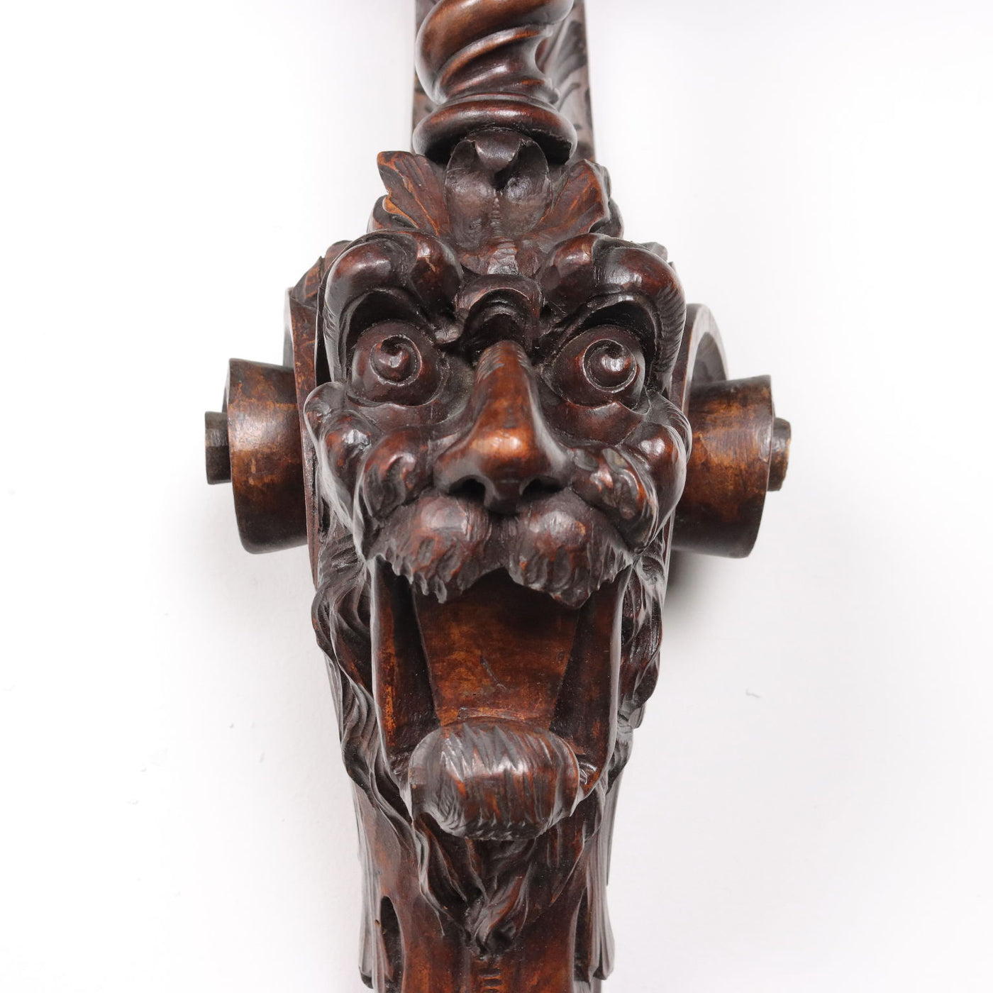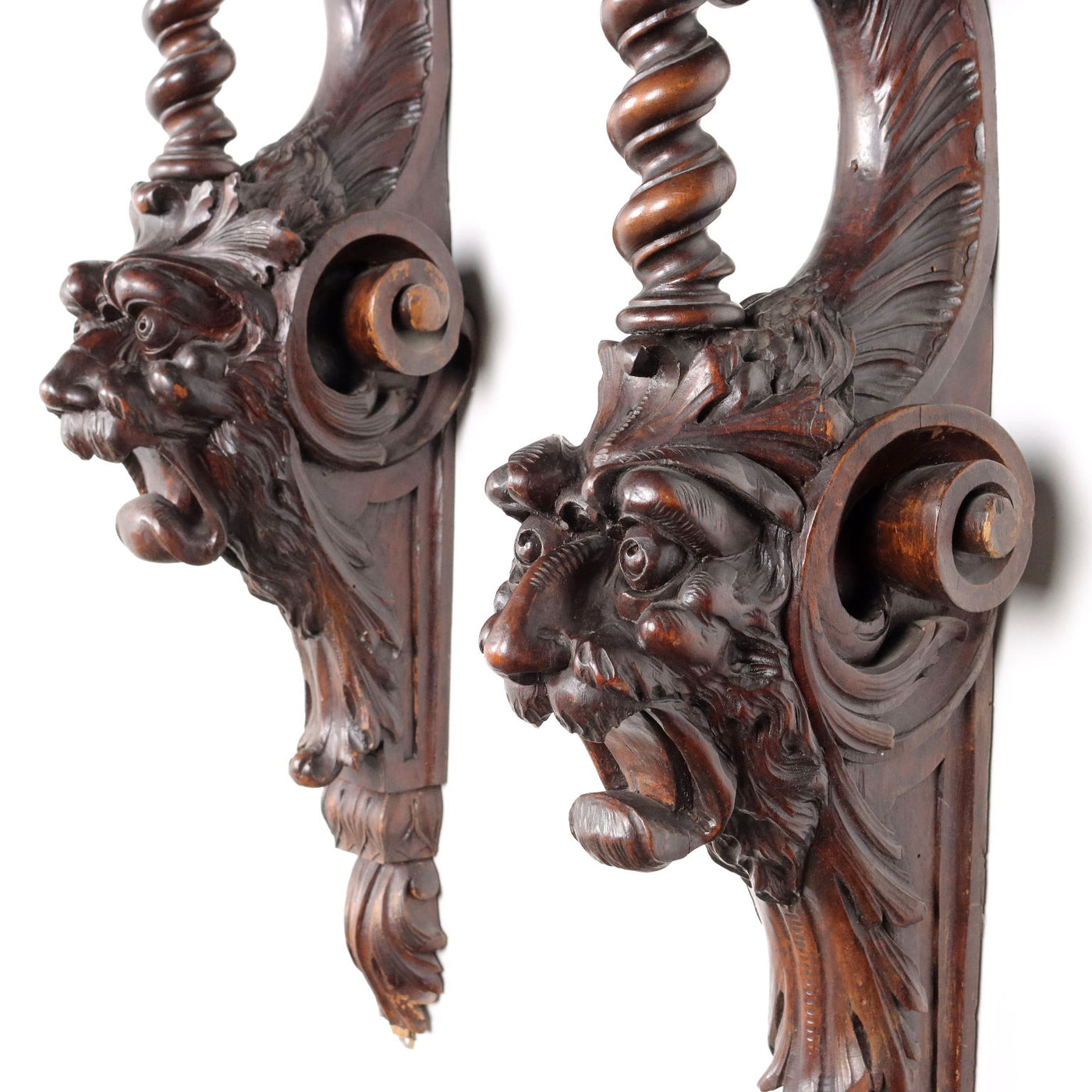 Pair of carved mahogany shelves with large masks supporting twisted columns on which the top stands. Italy 19th century consoles, wall table, support table, parietal table.