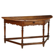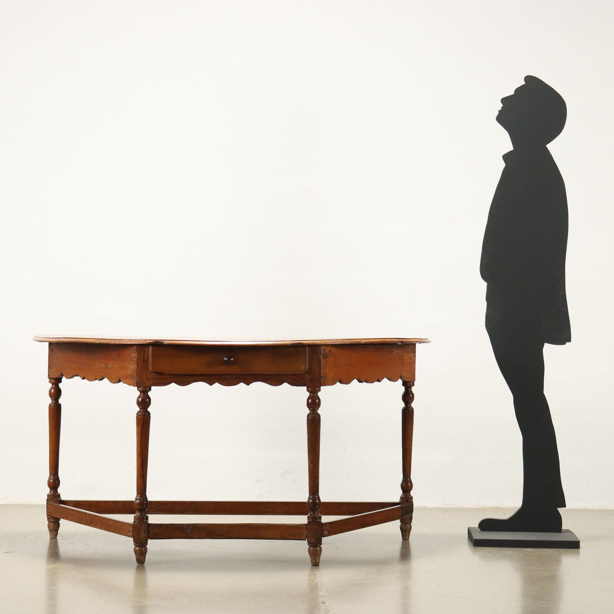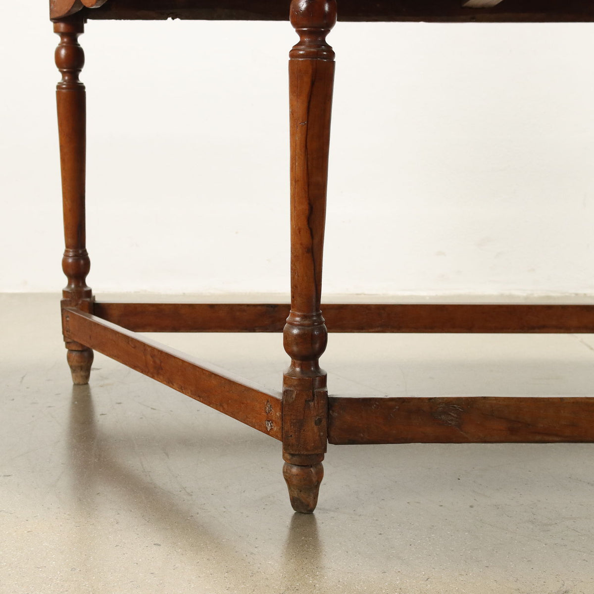 Console in cherry wood shaped in the under-top band with drawer and truncated conical legs decorated with turnings and connected by 4 crosspieces. Modifications and restorations. Italy, early 18th century consoles, wall table, support table, parietal table.