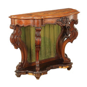 Umbertino period console, Made from a top with a carved band resting on a backrest with side uprights and a fabric panel, on the front wavy and carved uprights resting on a shaped top. In poplar and walnut and veneered in walnut root and bois de rose borders. consoles, wall table, support table, parietal table.
