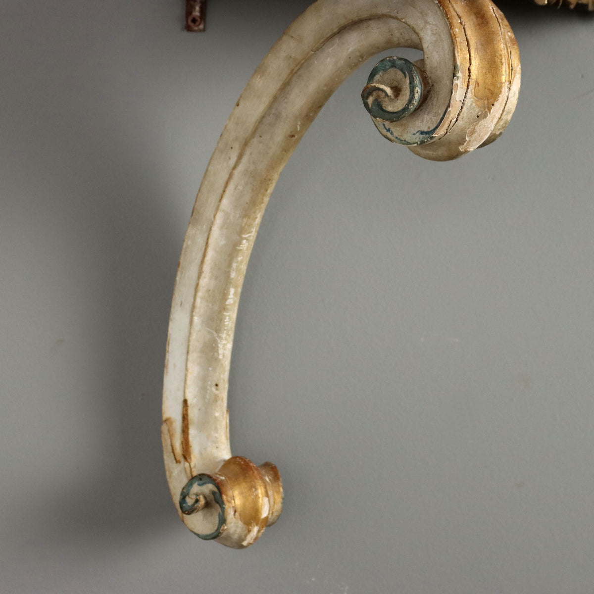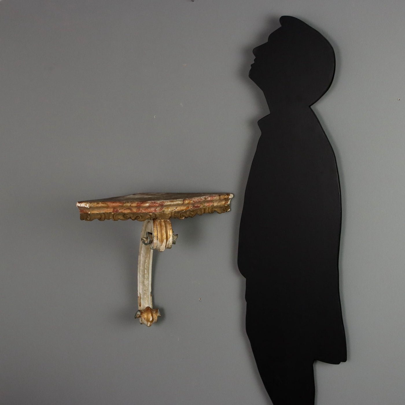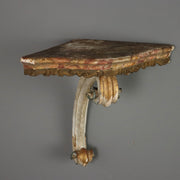 Corner shelf, in lacquered wood. Top painted in imitation marble with carved and gilded moulding underneath, supported by a volute carving culminating in curls. Italy, 18th century. consoles, wall table, support table, parietal table.