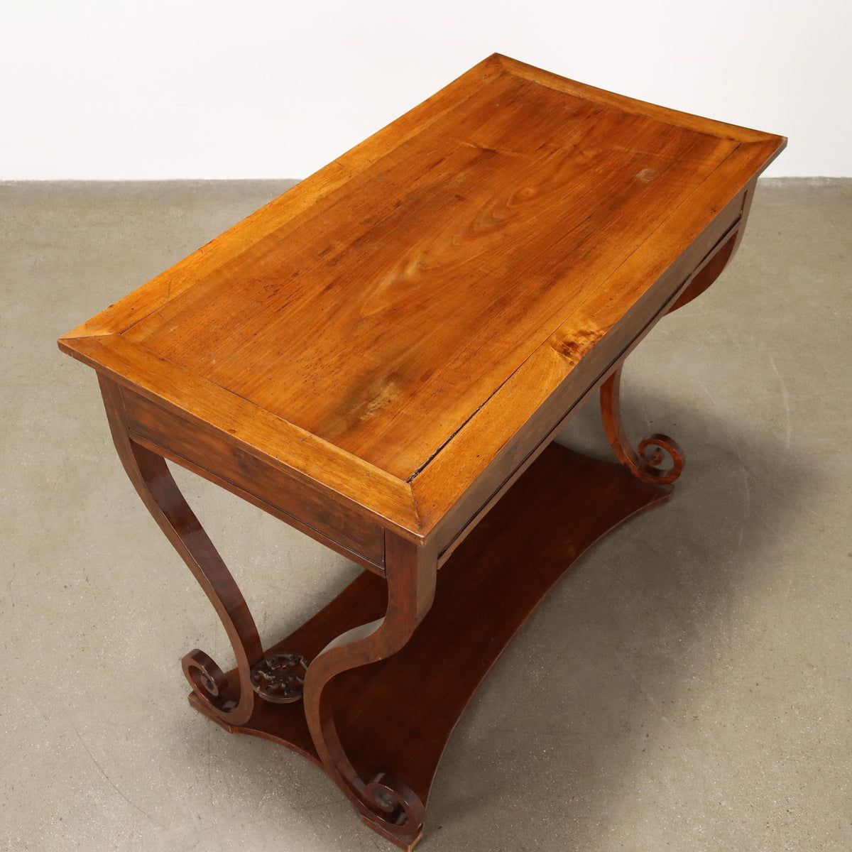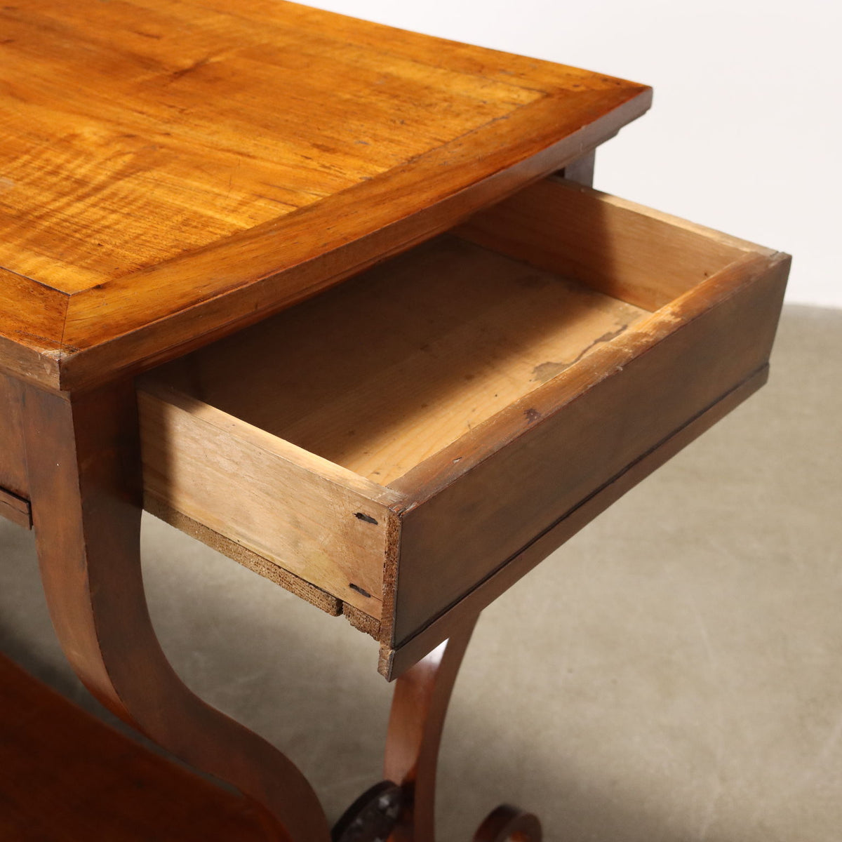 Empire writing desk in walnut, secret side drawers with release under the top, one of which is damaged. Lyre legs resting on a shaped base. Italy, second quarter of the 19th century. Writing Desks, table, desk.