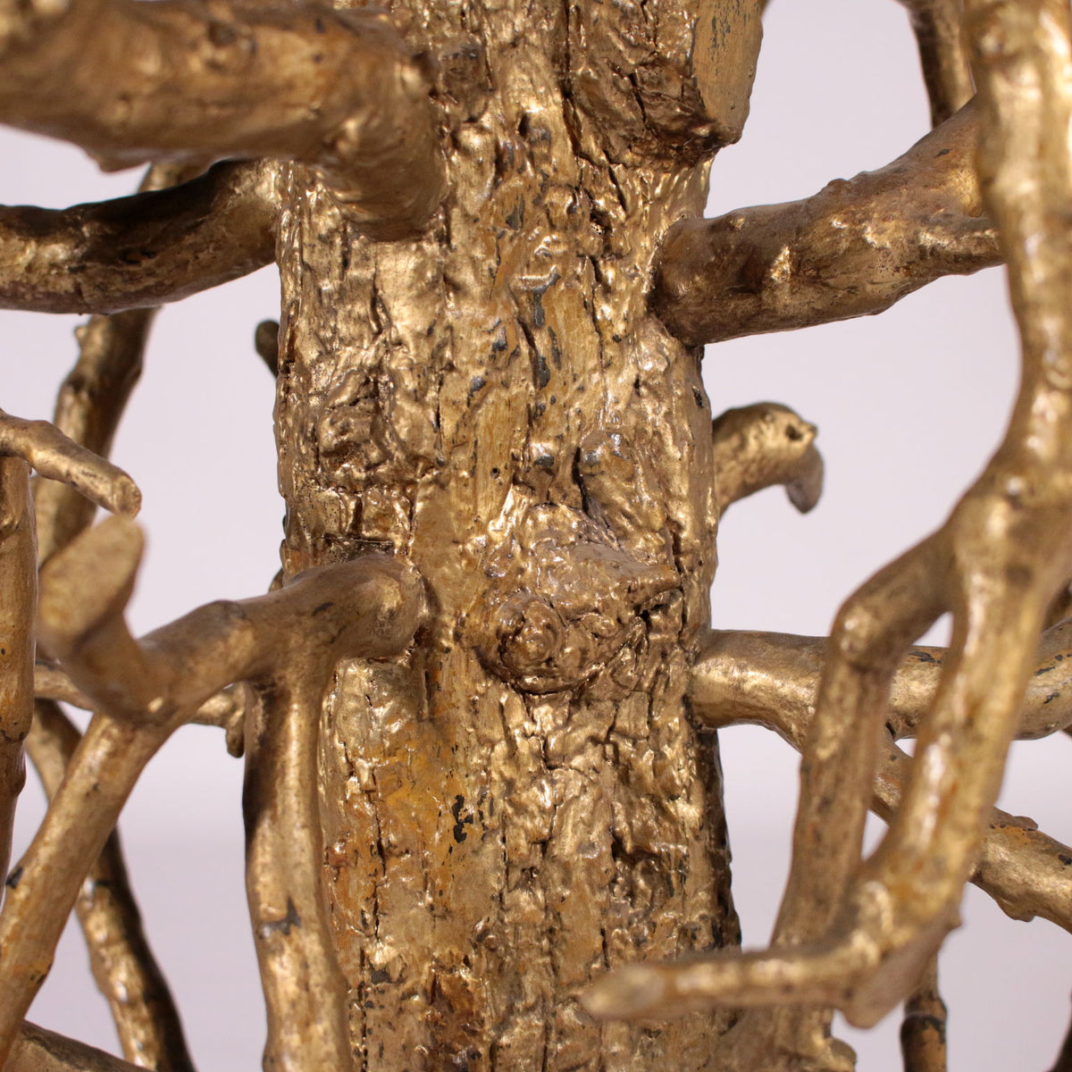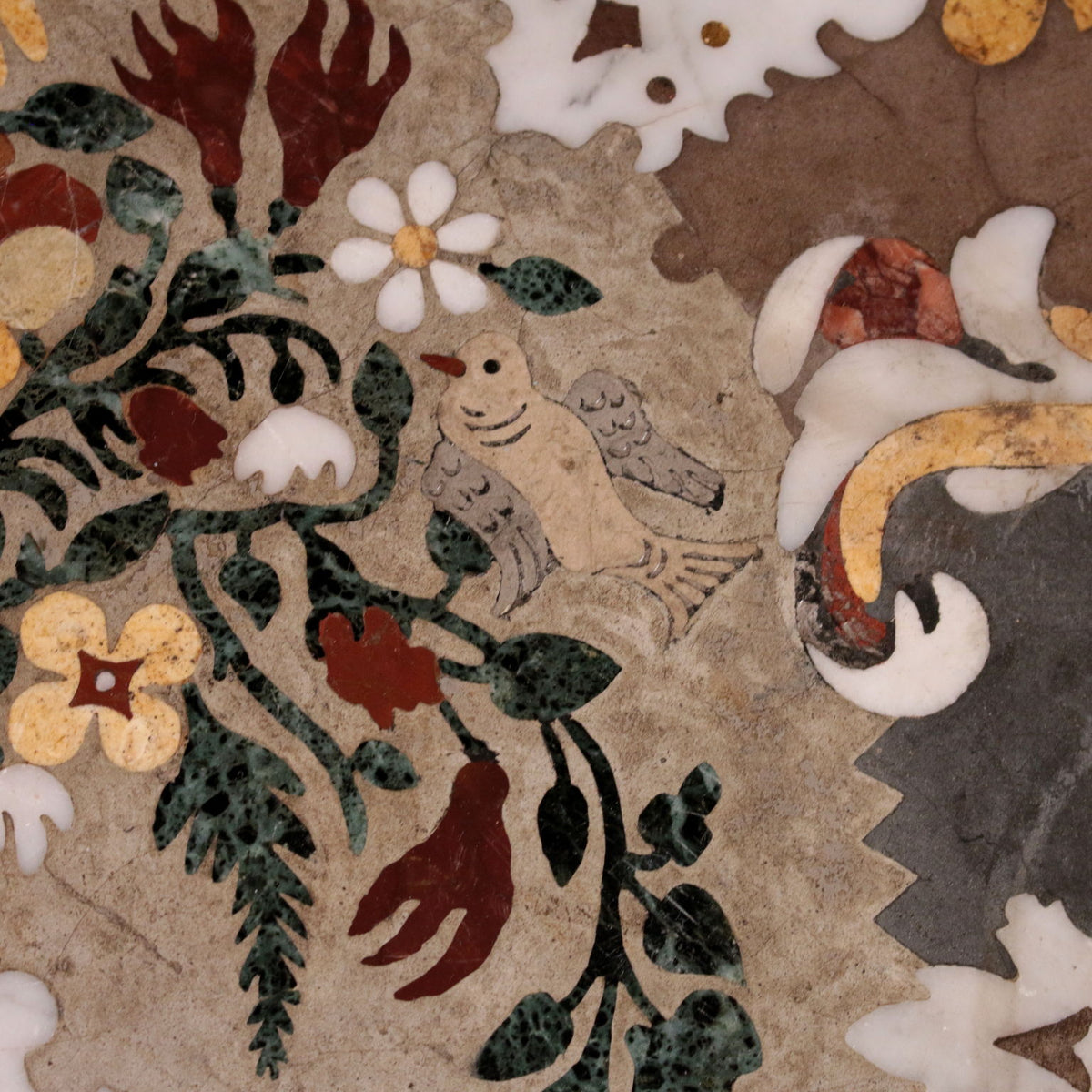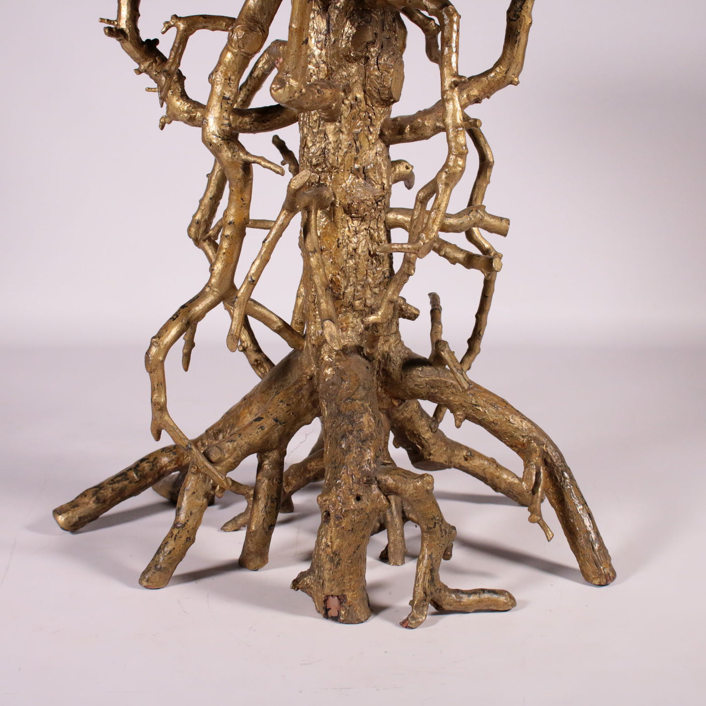 The supporting structure is made with a central trunk that act as baluster assembled with smaller branches; entirely gilded. Committed marbles top: different stony typologies are used to create a centra vese with flowers on top of which a dove alights. All around there is an edging inside which are represented leafy scrolls and plant patterns; the top's perimeter is defined by a greek fret with alternating triangles. Table, antiques tables, ancient table.