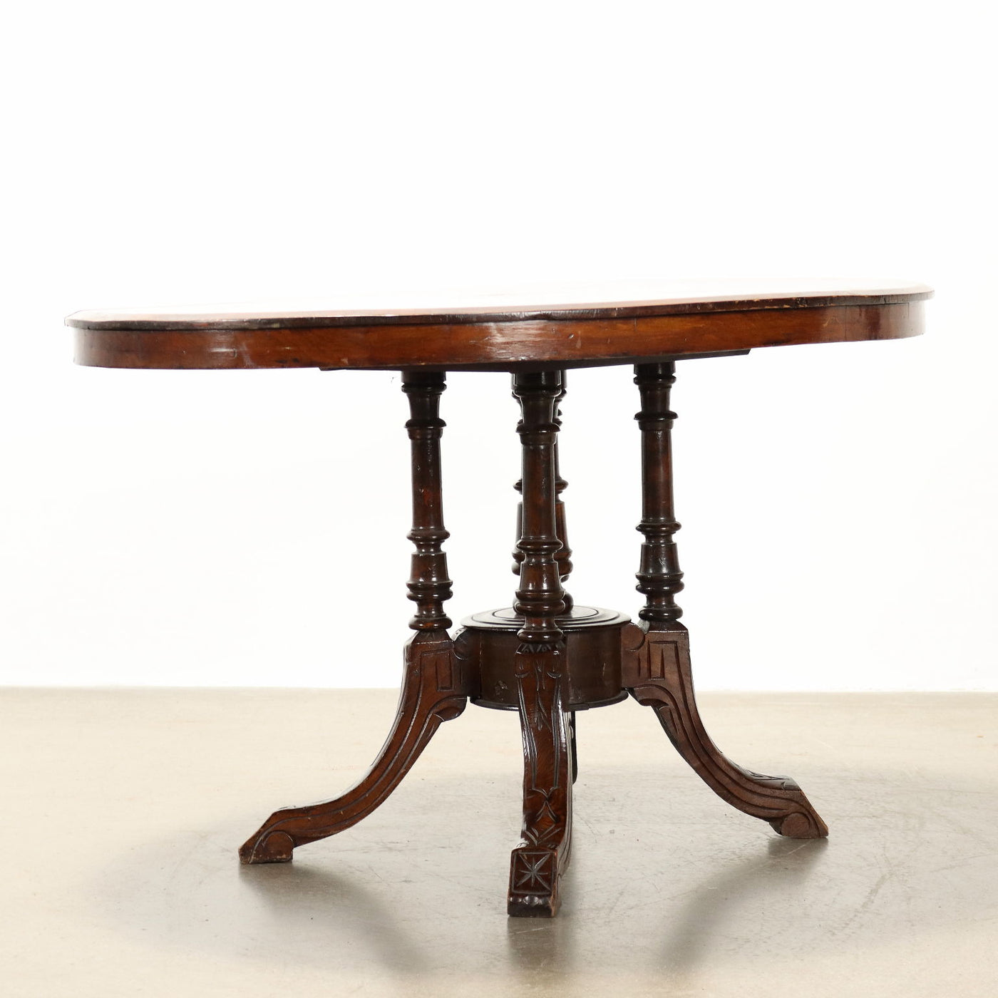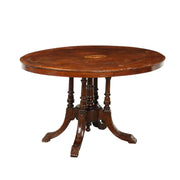 English table resting on curved feet and supported by five turned legs, in elm; the top is veneered in walnut with maple inlays. Table, antiques tables, ancient table.