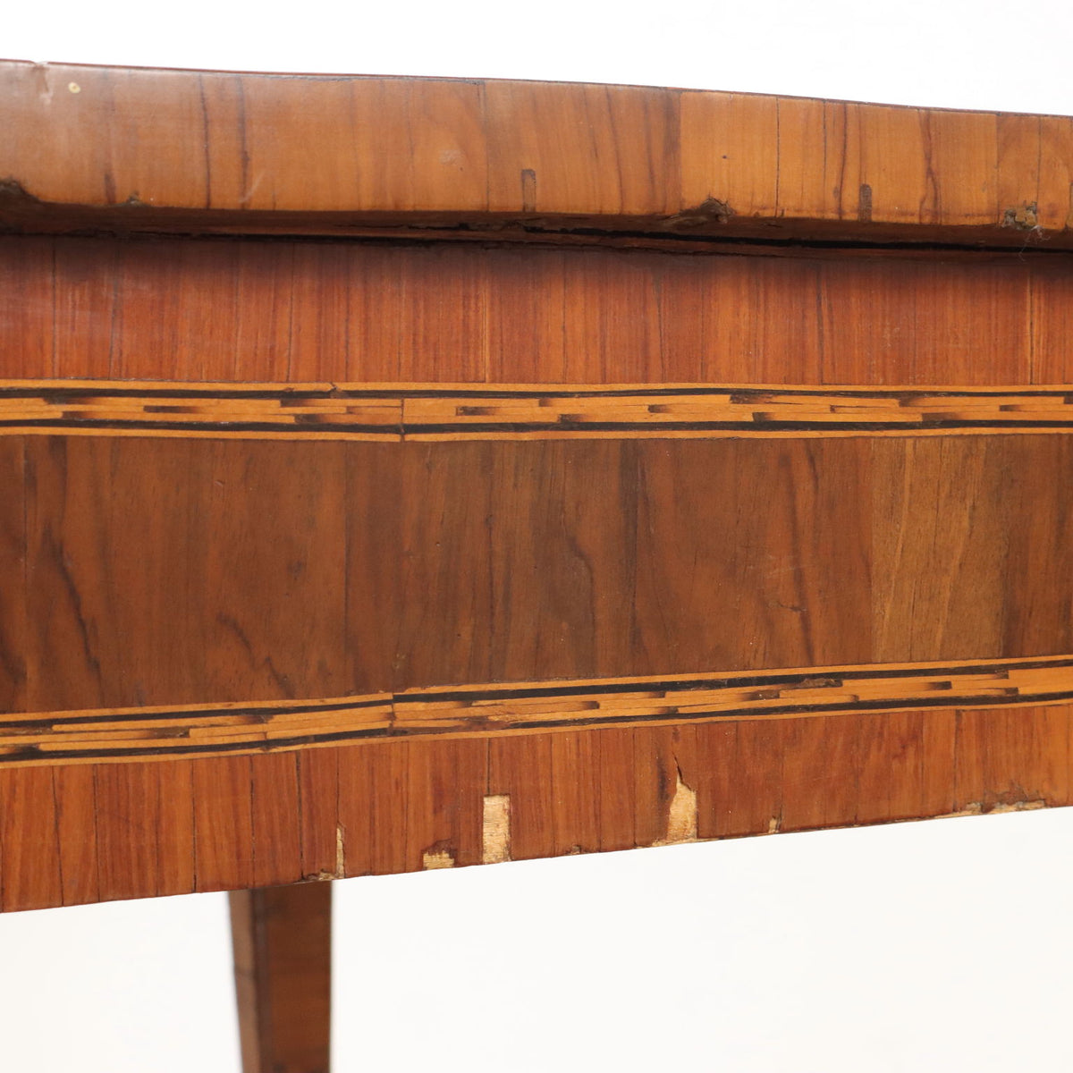 Neoclassical table in poplar with a square section, completely veneered. Top with inlay with a geometric score made of olive and carob borders, crossed to form four small inlaid rosettes, the reserves are veneered in quadripartite walnut, the fillets that outline the borders are in maple and black-stained chestnut. The same motifs decorate the bands while the legs, truncated-conical, are veneered in olive wood. Small missing parts. Emilia, last quarter of the 18th century. Table, antiques tables, ancient table.