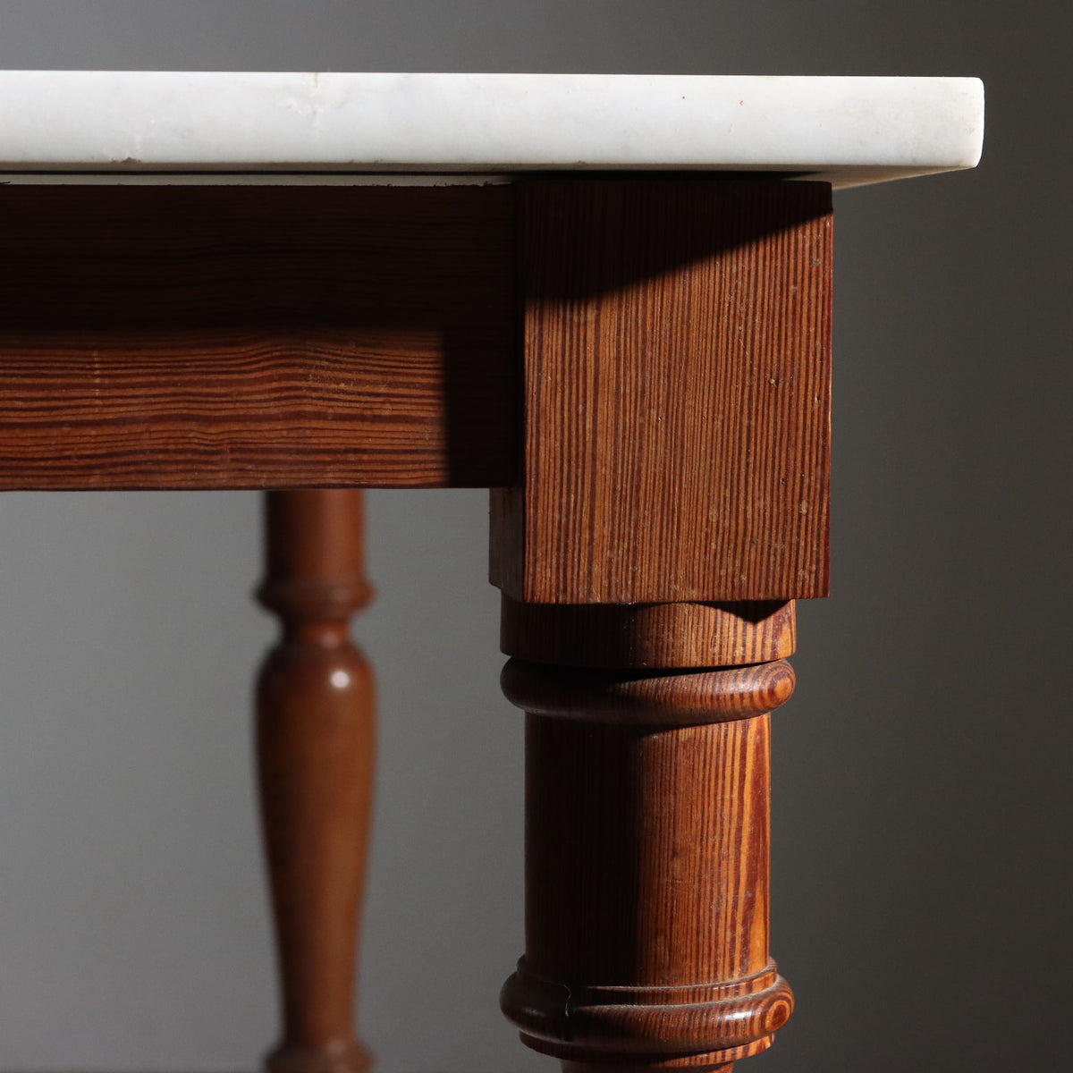 Work table, made of larch wood with four turned legs connected by a band under the top and at the bottom just above the turned foot. On these bands rest two white marble tops, revised only in cleaning by our laboratories is ready to be used in the kitchen thanks to the resistant and washable marble tops. Table, antiques tables, ancient table.