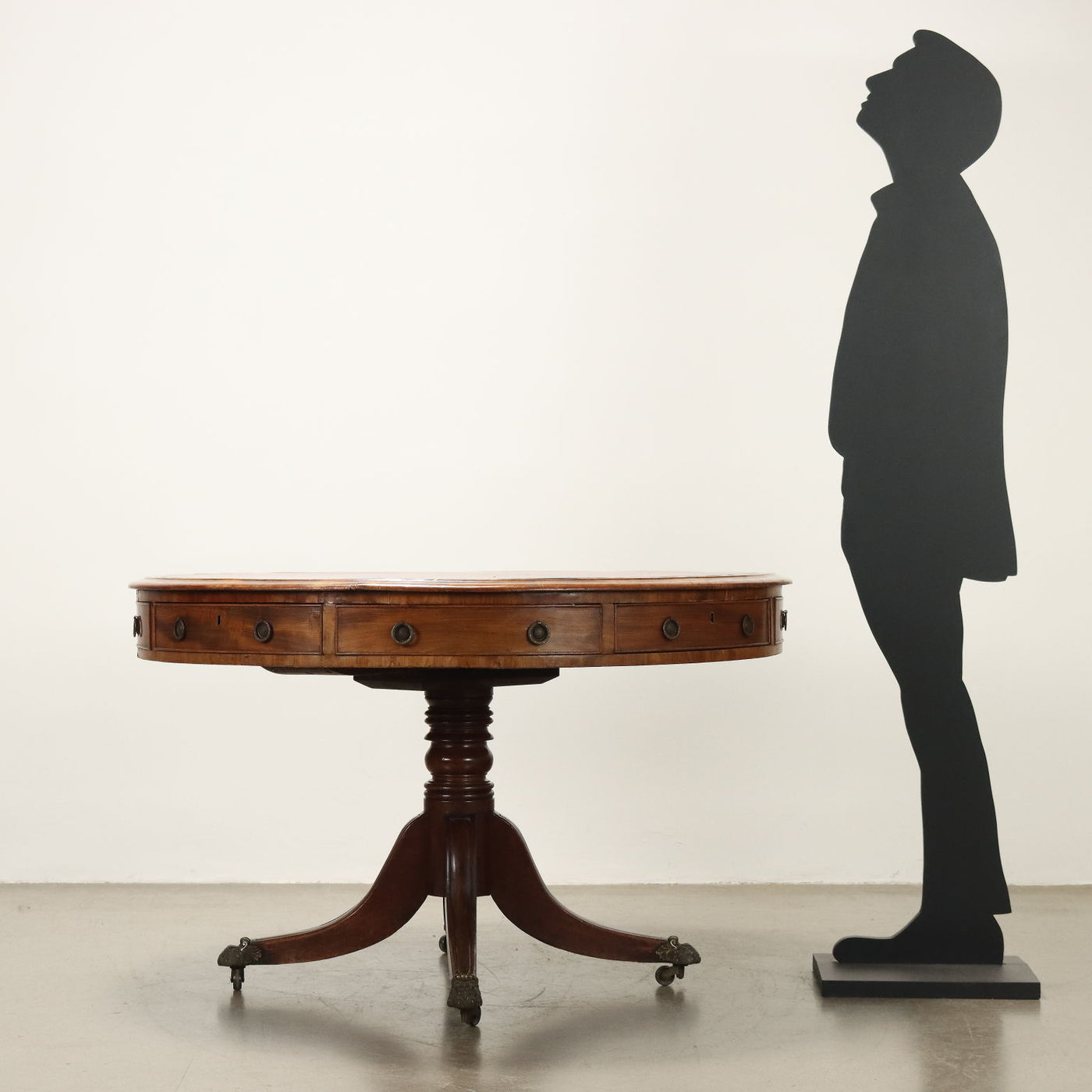 Large library table, England mid-19th century, victorian period. A turned support supported by four sabre-shaped legs serves as a support for the circular top. The top is covered in red leather, worked with gilded motifs, has 4 drawers in the band alternating with four false drawer spaces. The supports are made of mahogany and veneered in the under-top band on the mahogany top with a carved end-grain wood edge. Bronze shoes chiseled in the shape of a feline paw, with brass wheels, Bronze drawer handles in the shape of a rosette, original brass-plated locks. Table, antiques tables, ancient table.