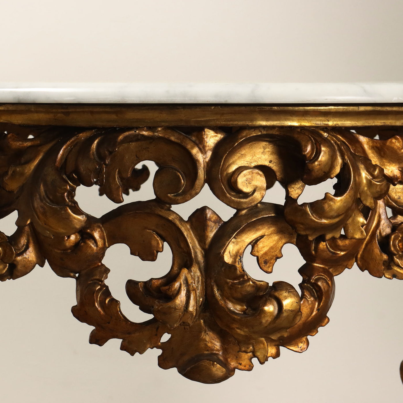 Eclectic table in carved and gilded wood, four legs with opposing “C” movement and leaf carvings, joined to the cross base with a central plume. Perforated aprons, carved with leaf motifs, scrolls and flowers. Non-contemporary white marble. Italy, 18th century. Table, antiques tables, ancient table.