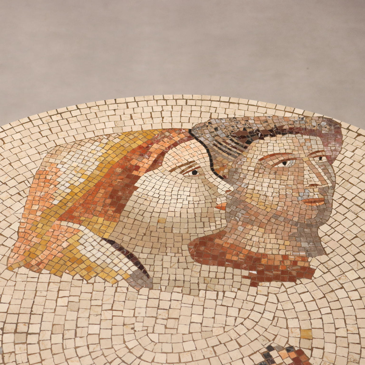 Round table with a mosaic top depicting female and male faces and abstract figures. Cross-section plinth base in walnut carved with curls and scrolls. Italy, 19th century. Table, antiques tables, ancient table.