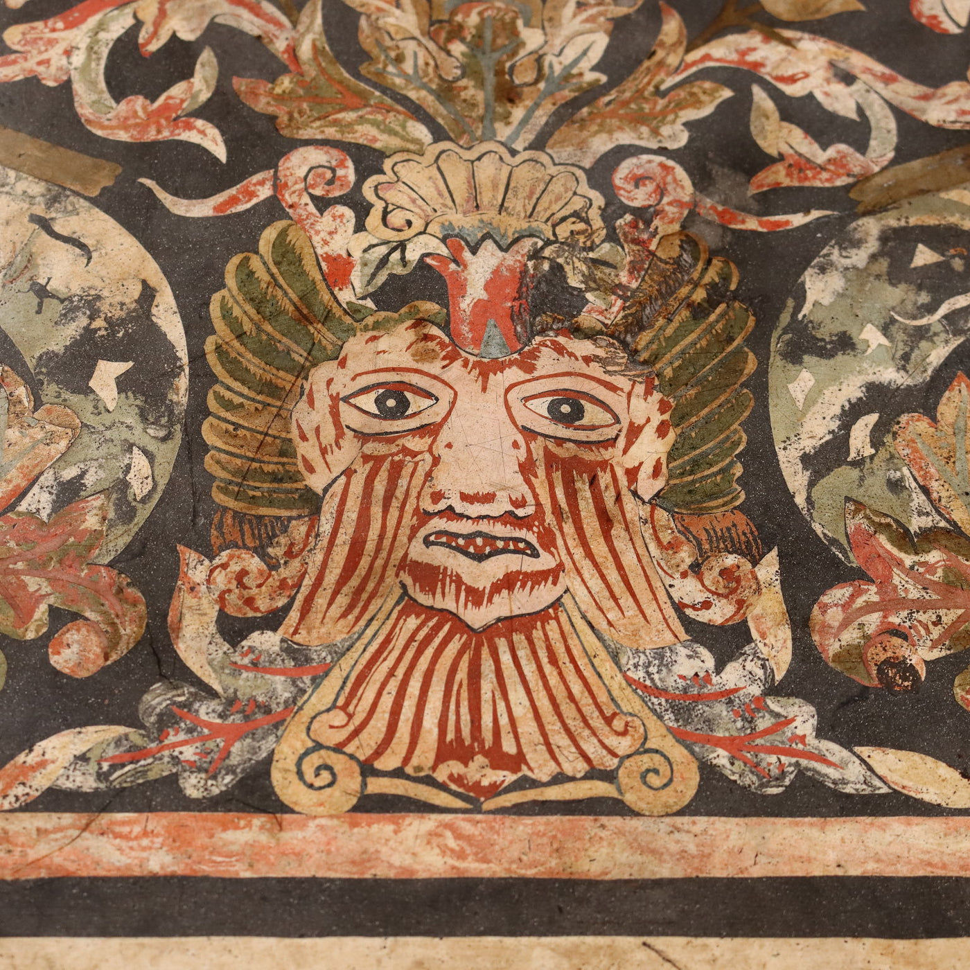 Ebonized walnut table, truncated pyramidal legs with carved leaf capitals, joined to a curved cross-shaped base with a central plume. The tabletop features a beautiful scagliola panel depicting a central mask, a pair of birds, doves, and snakes, and a floral and leafy intertwining that fills the top, all enclosed by a double frame. Tuscany, late 17th century. Table, antiques tables, ancient table.