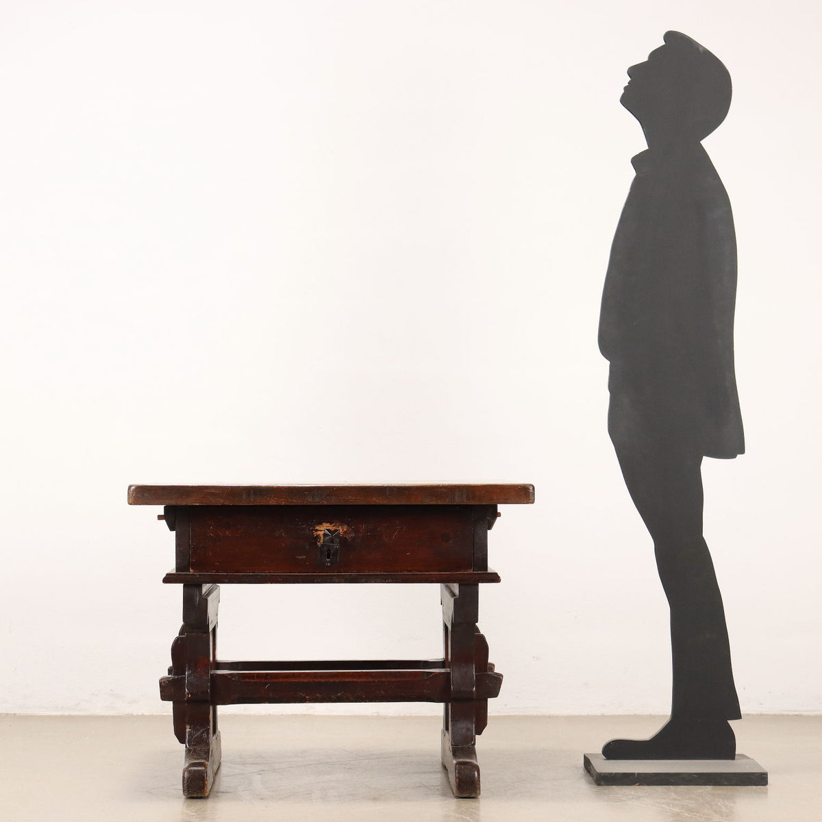 Coffee table supported by shaped uprights connected by a pair of crosspieces, there is a drawer in the under-top band; in pine. Coffee tables, ancient coffee table.