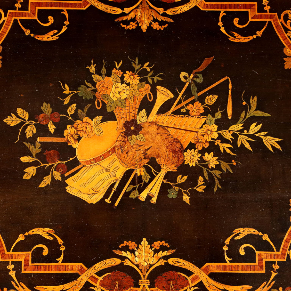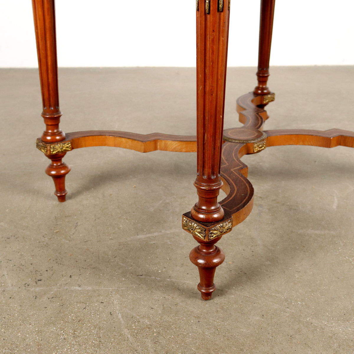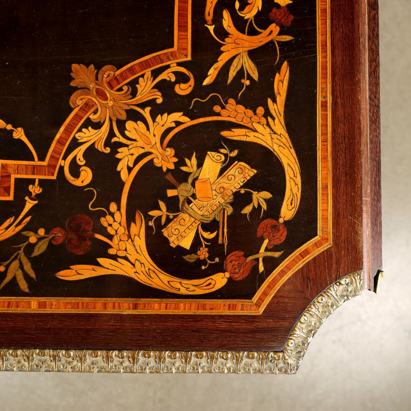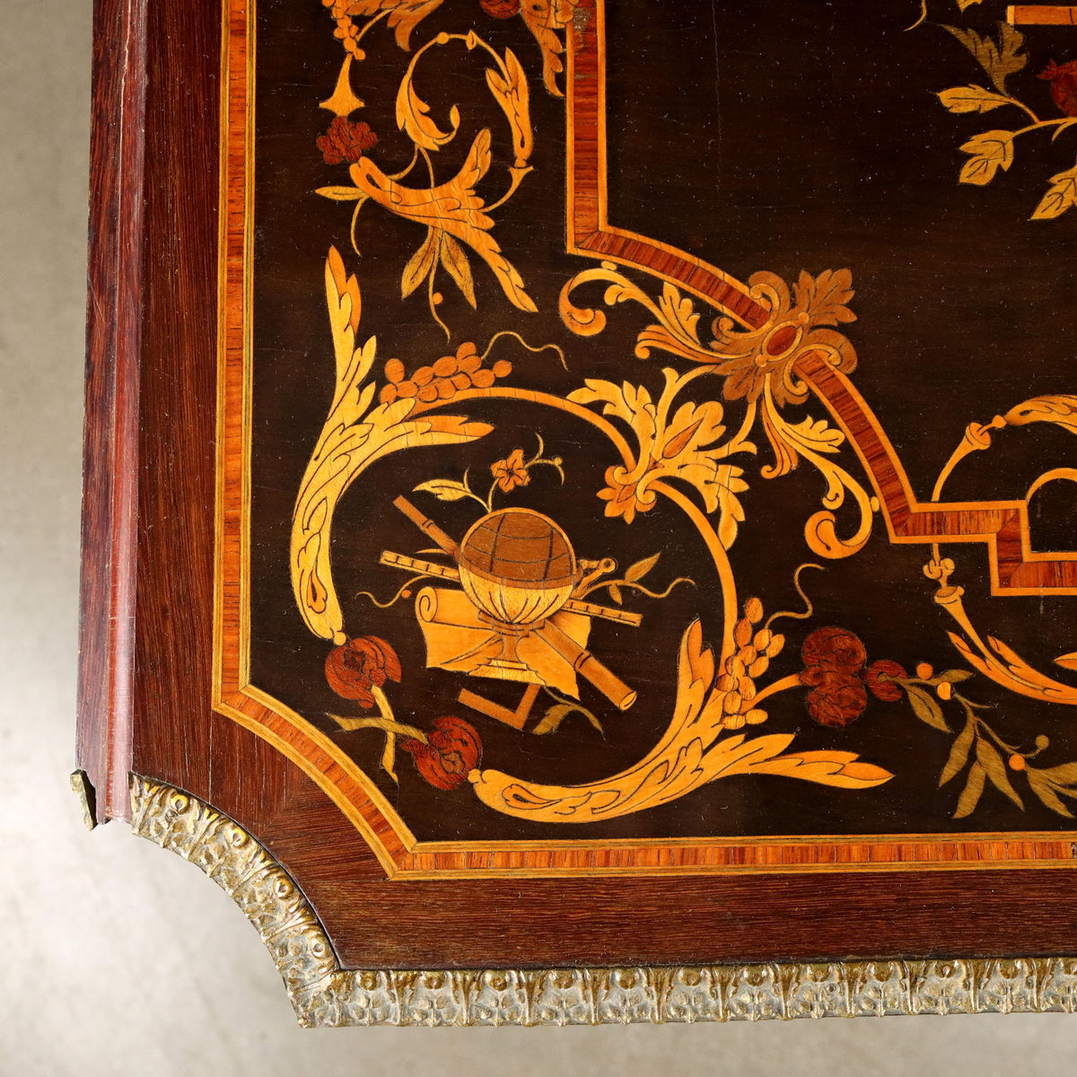 Neoclassical style side table made in the early 1900s, England. Four turned legs joined by a crosspiece support a top with opening side panels, a drawer in the band. Finely chiseled and gilded bronze applications; the entire surface is richly inlaid with various types of wood. Coffee tables, ancient coffee table.