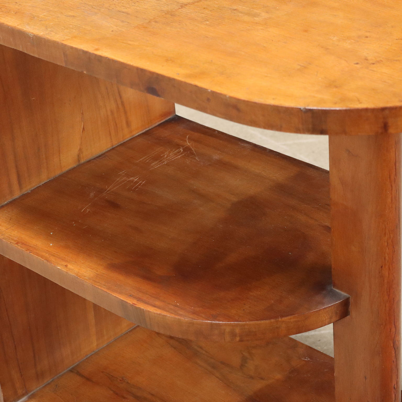 Deco coffee table in walnut veneer, three shelves joined by a side panel and a square-section column. Italy, first quarter of the 20th century. Coffee tables, ancient coffee table.