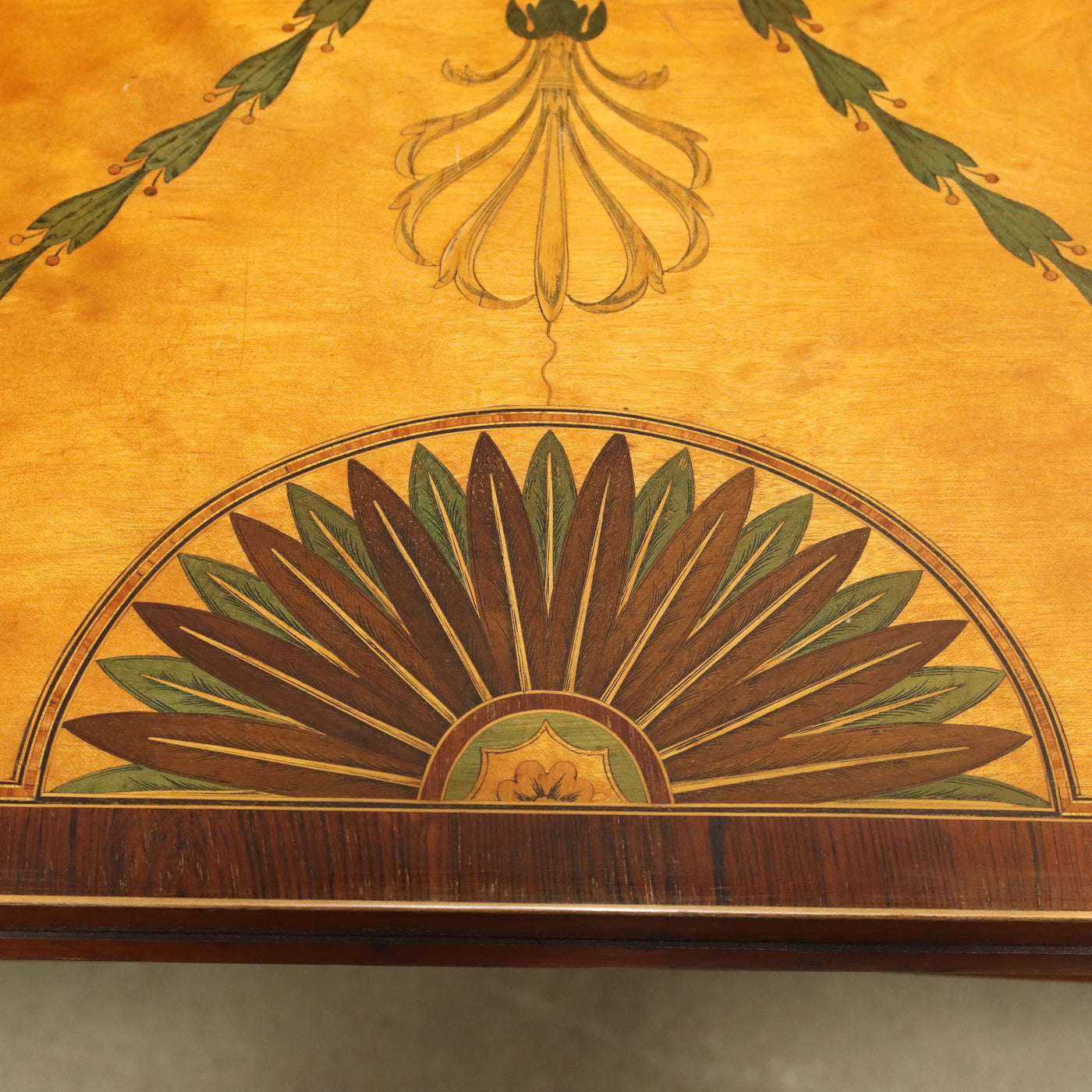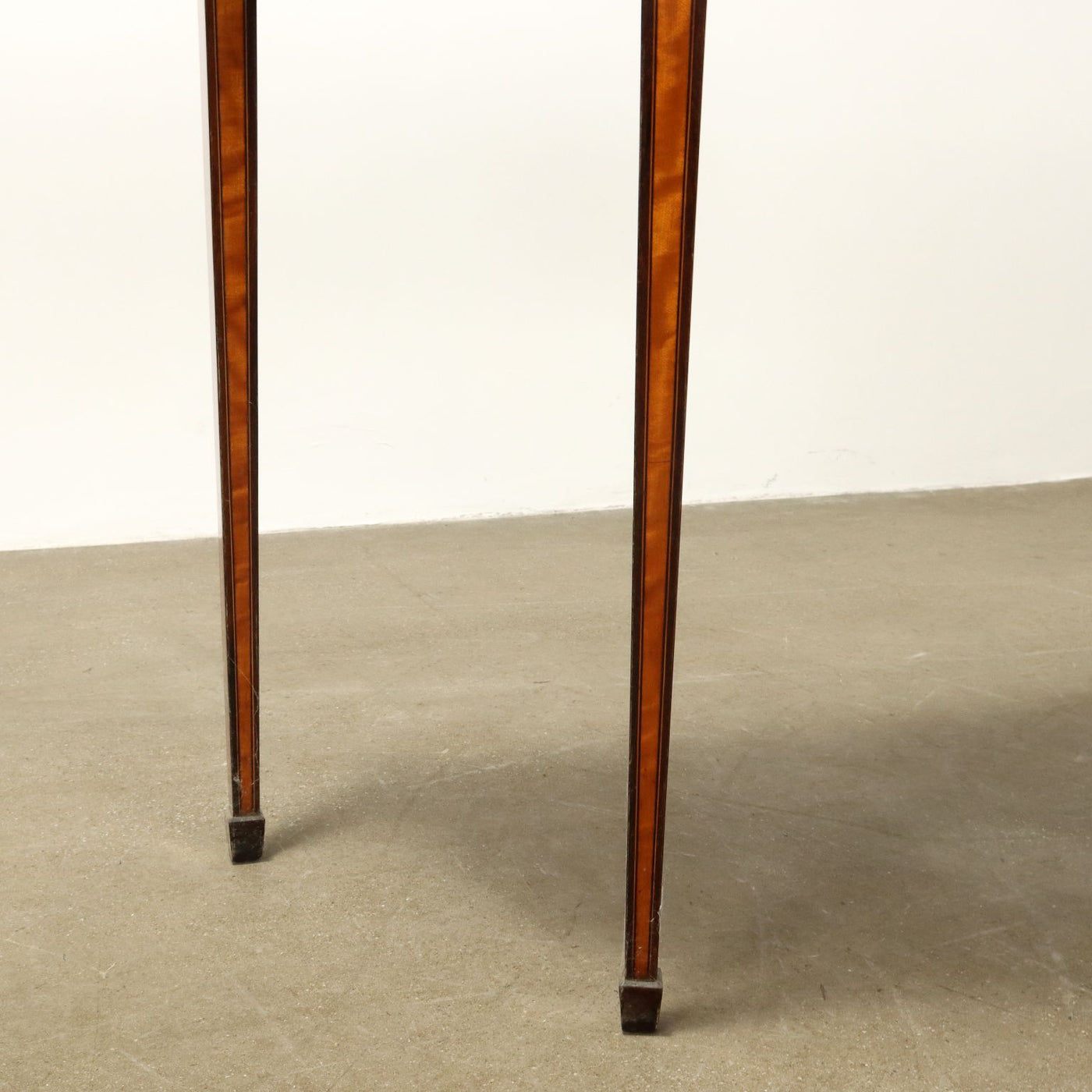 Pair of George III style wall tables that open to play, made in the Victorian era. The tables have four truncated pyramidal uprights of which the two rear ones, open like compasses, allow the support of the upper half top forming a round gaming table covered in green felt. The legs, like the bands and the tops, have a rosewood veneered border with fillets to outline reserves veneered in satinwood. In the reserves of the bands there are inlaid floral spiral and anthem motifs, on the tops they are repeated with festoons of bellflowers and a half rosette in the centre. The finely crafted inlays in various woods and stained maple create a strong chromatic effect, accentuated by the burin definitions; on the back of a small table there is a partially preserved label of a deposit or transport. Coffee tables, ancient coffee table.