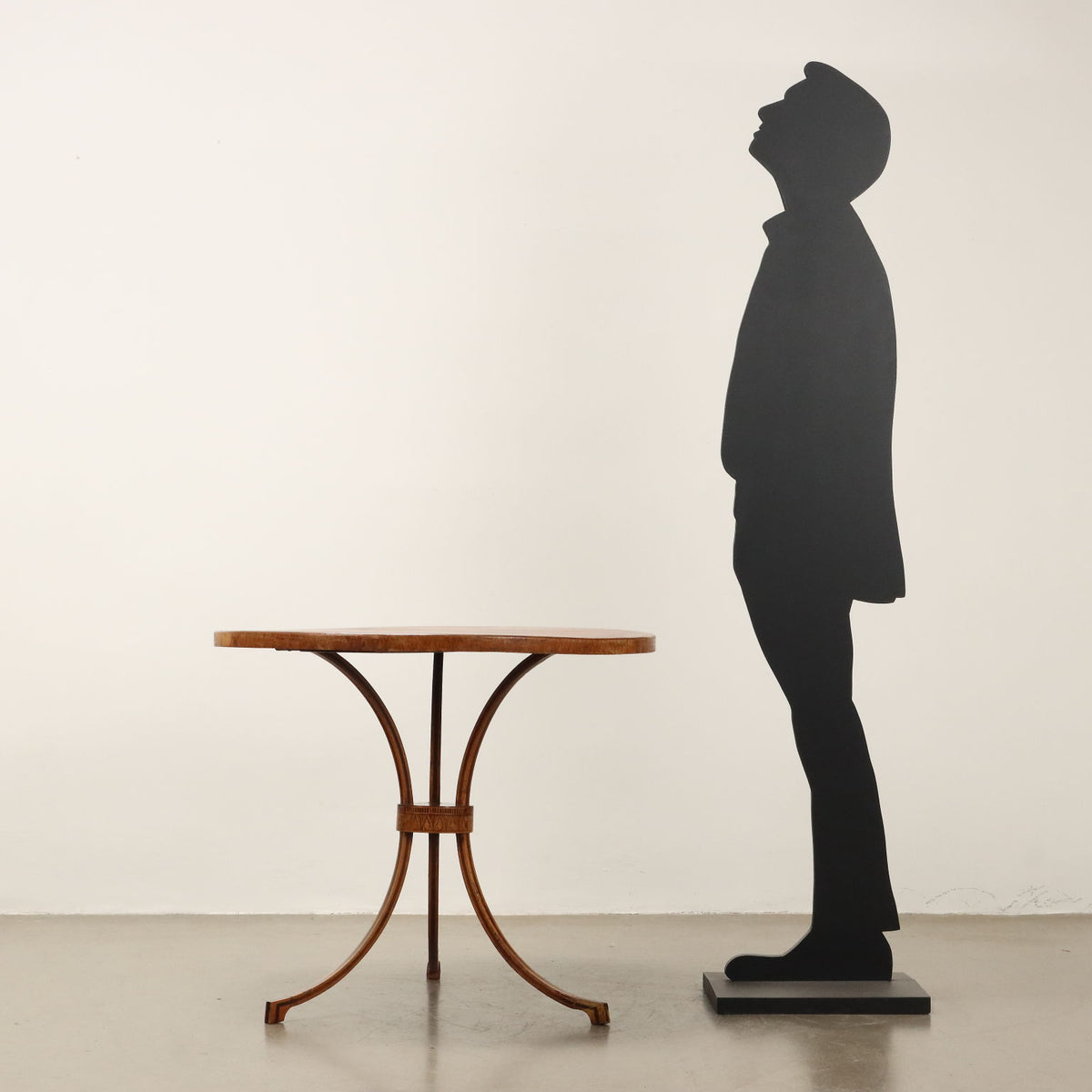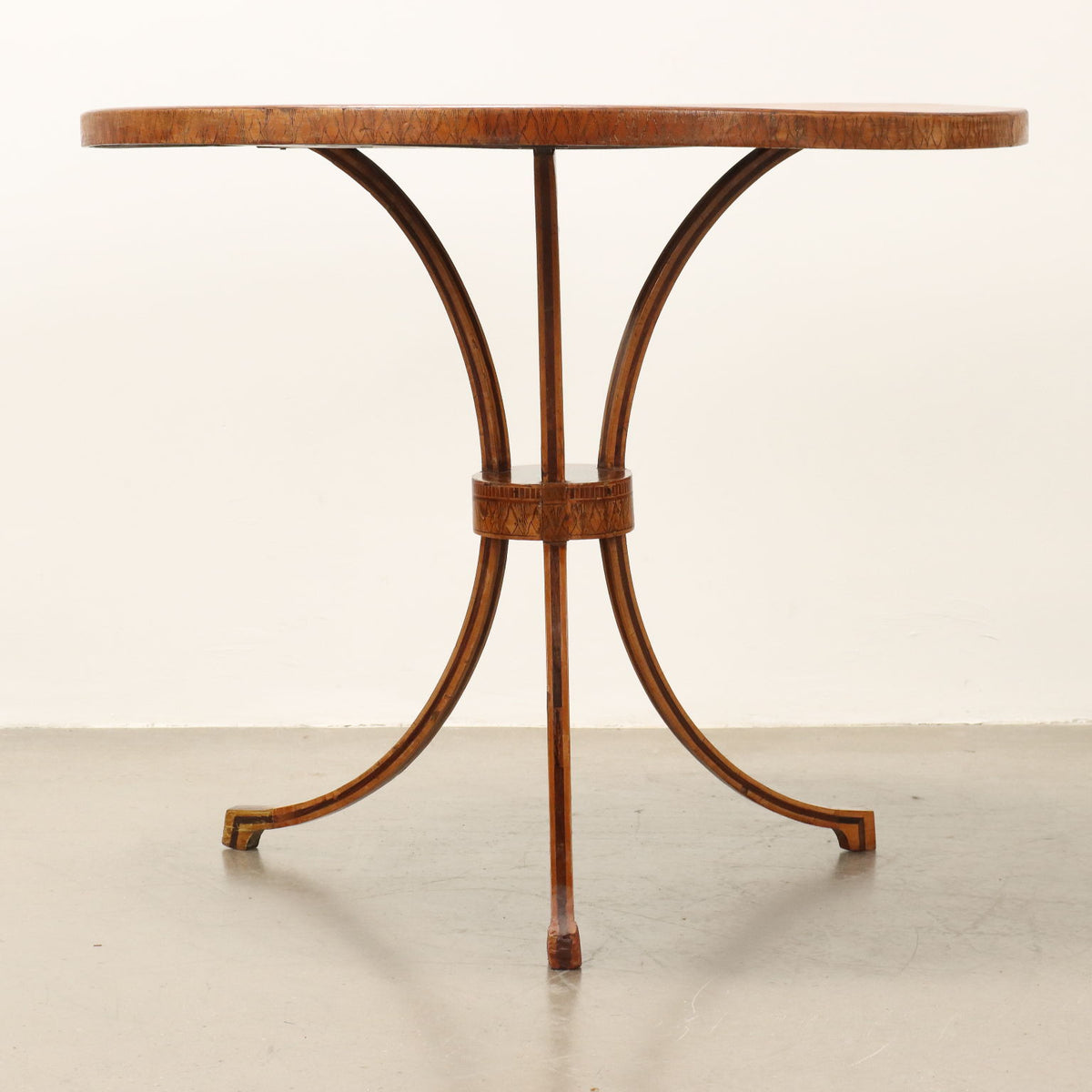 Mahogany coffee table finely painted with floral garlands and central musical panoply. Maple and walnut binding. Iron leg veneered in maple and mahogany. Restored. England, late 18th century. Coffee tables, ancient coffee table.