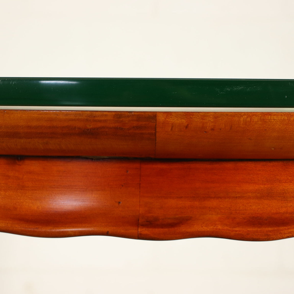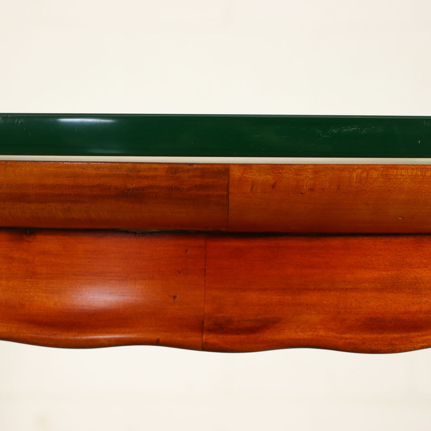 Table with carved decorative details and small drawers under the top, solid beech wood and mahogany veneer, entirely cherry stained, remarkable clear glass laying on top. Vintage Tables, vintage table, 1970s table, 1940s table, 1930s table, 1960s table, 1950s table, design table, desk, writing desk.