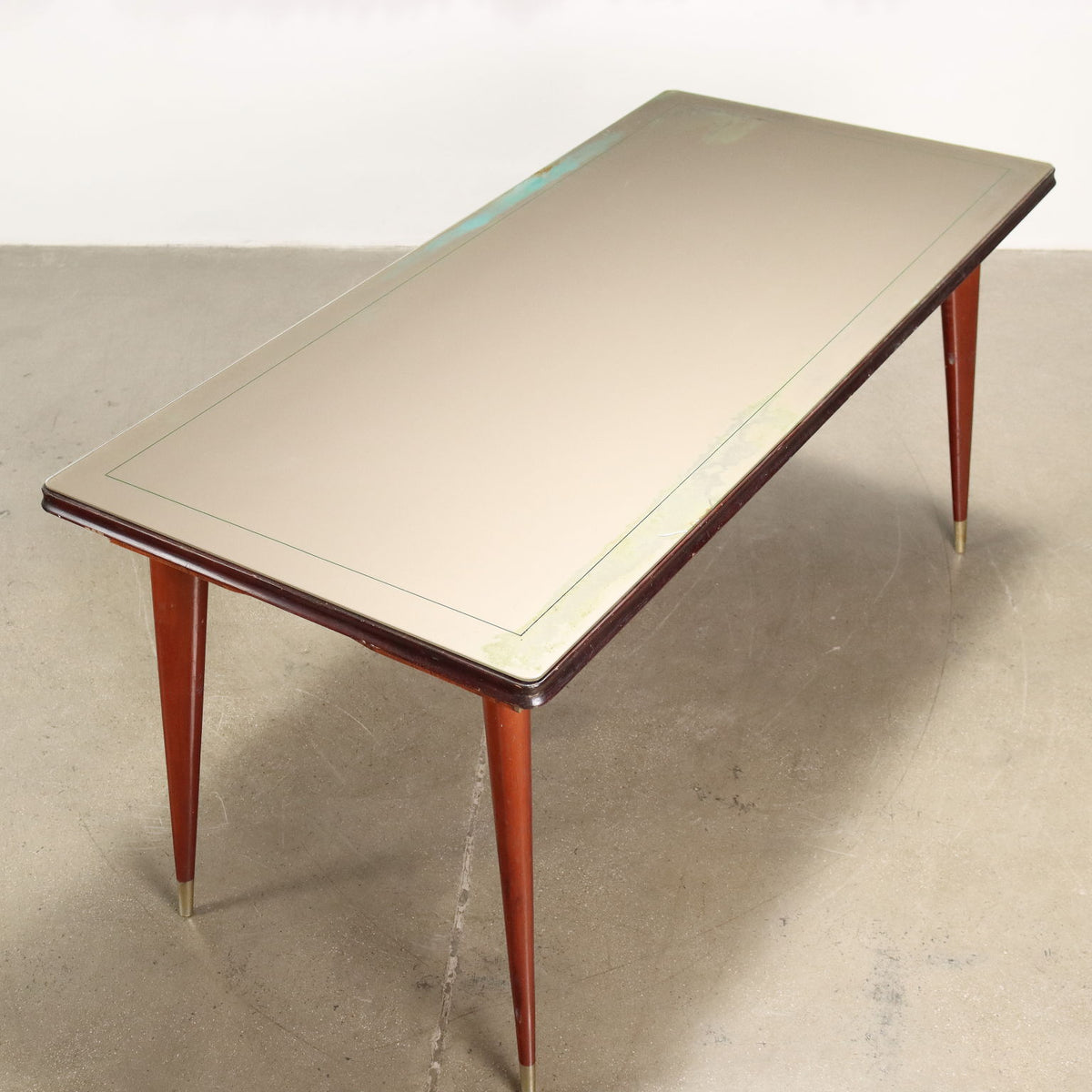 Table; tinted beechwood with back treated glass, brass tips. Vintage Tables, vintage table, 1970s table, 1940s table, 1930s table, 1960s table, 1950s table, design table, desk, writing desk.