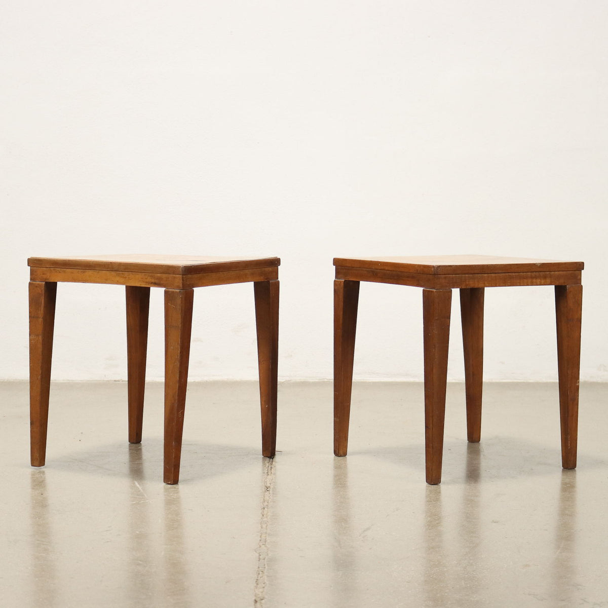 Pair of vintage Italian-made coffee tables in walnut wood with square top and slender legs in a truncated pyramid shape; requires restoration work. Vintage Coffee table, smoker's coffee table, 1970s coffee table, 1960s coffee table, 1950s coffee table, 1940s coffee table, 1930s coffee table, design coffee table.
