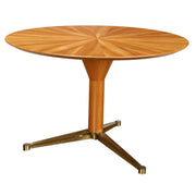Elegant table with brass and wood base, top in veneered wood with concentric segments of maple wood. Vintage Tables, vintage table, 1970s table, 1940s table, 1930s table, 1960s table, 1950s table, design table, desk, writing desk.