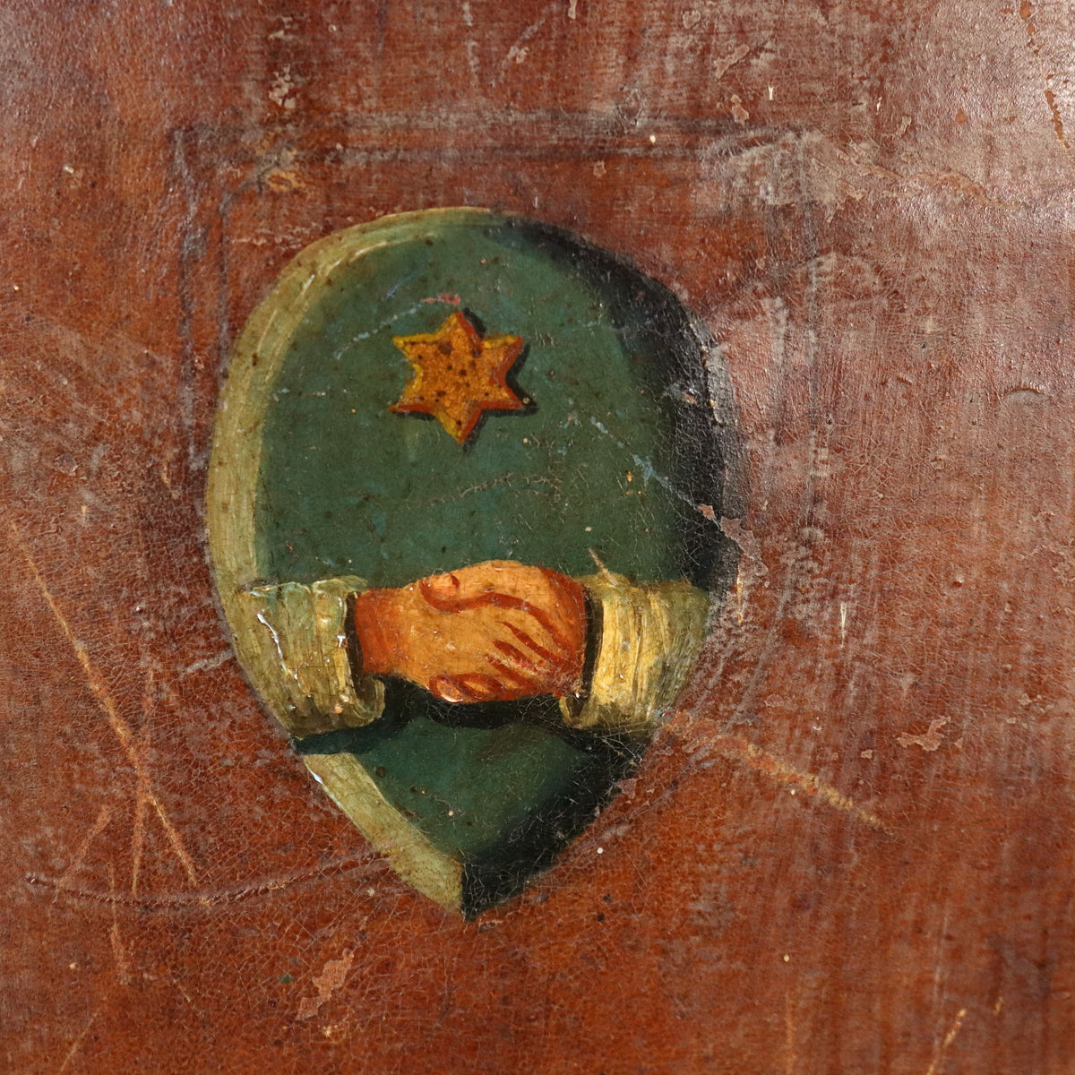 Pair of baroque chairs with shaped backs and padded seats upholstered in leather, Umbria, early 18th century. Walnut structure, crosspieces and spool front legs. A coat of arms is painted in the center of the backrests, which seems to correspond to the coat of arms of the Fedeli family of Spoleto, portraying a dressed faith (in heraldry the faith indicates two hands shaking) with a six-pointed gold star at the top. The leather covering of one seat was replaced in the 19th century. Chairs, ancient chair, office chair, stool.