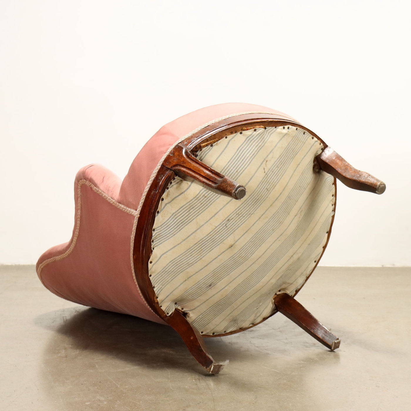 Pair of antique armchairs in walnut, curved legs, padded seat, back and armrests. Italy, 19th century. Armchair, high chair, throne, ancient armchair, office's armchair, bergère .
