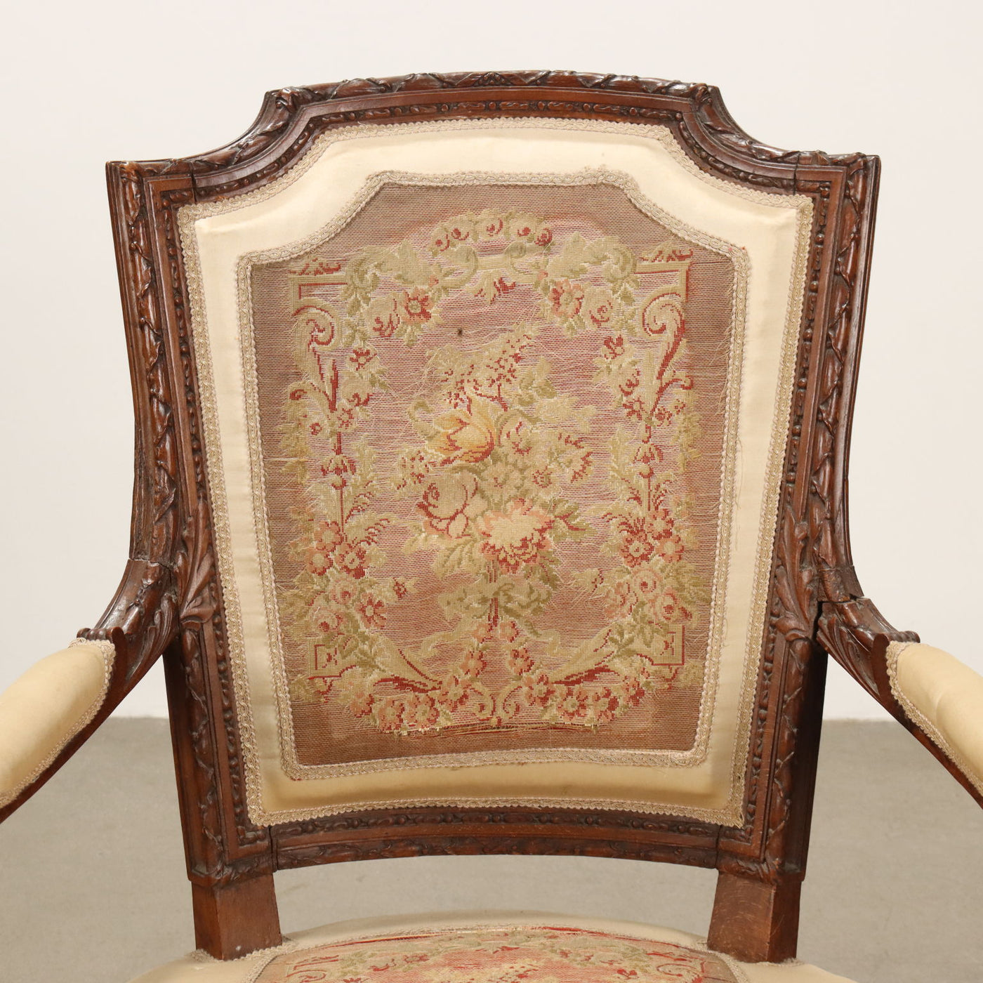Armchair in walnut-stained beech, Neoclassical carvings on the entire surface, truncated conical legs, padded seat, armrests and backrest, embroidered fabric. Italy, 19th century. Armchair, high chair, throne, ancient armchair, office's armchair, bergère .