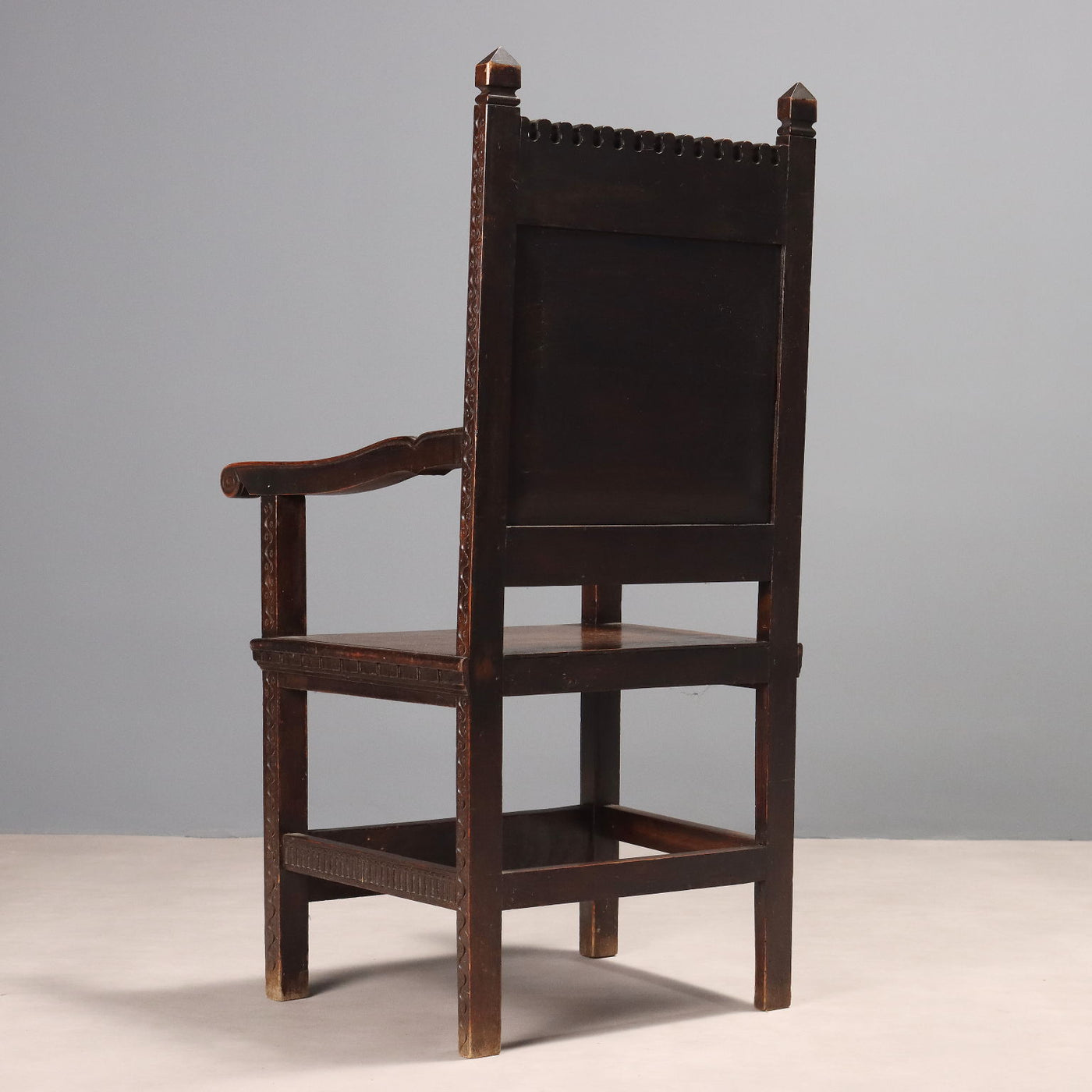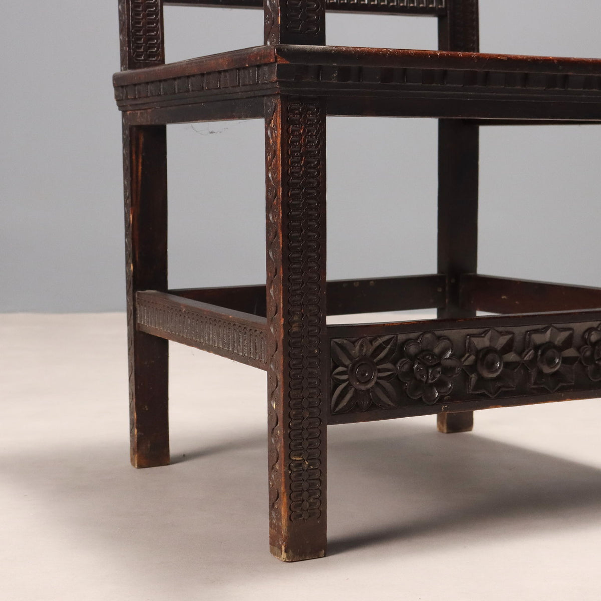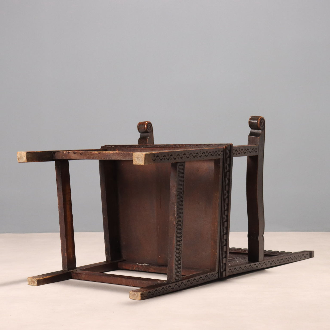 Neo-Renaissance style chair in walnut, gouging on the uprights and connecting bands, geometric, leafy and floral carvings on the back and front band. Italy, late 19th century. Chairs, ancient chair, office chair, stool.