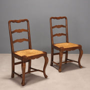 Pair of walnut chairs, open backrests, curved legs joined by a crosspiece. Straw-seated seat. Italy, 20th century. Chairs, ancient chair, office chair, stool.