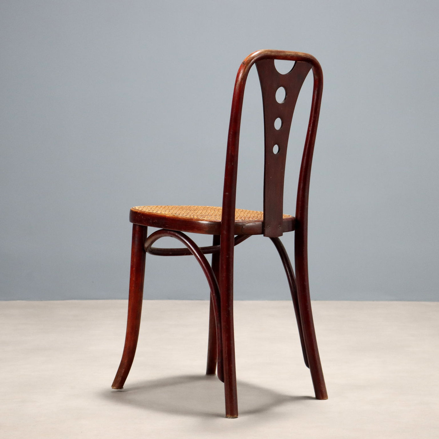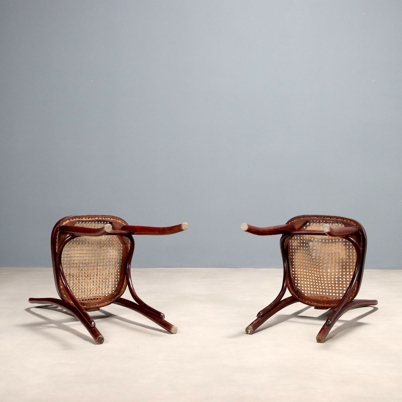 Pair of Thonet chairs in red-stained bent beech, open backrest with three-pierced panel, cane seat, one of which is broken. Austria, late 19th century. Chairs, ancient chair, office chair, stool.