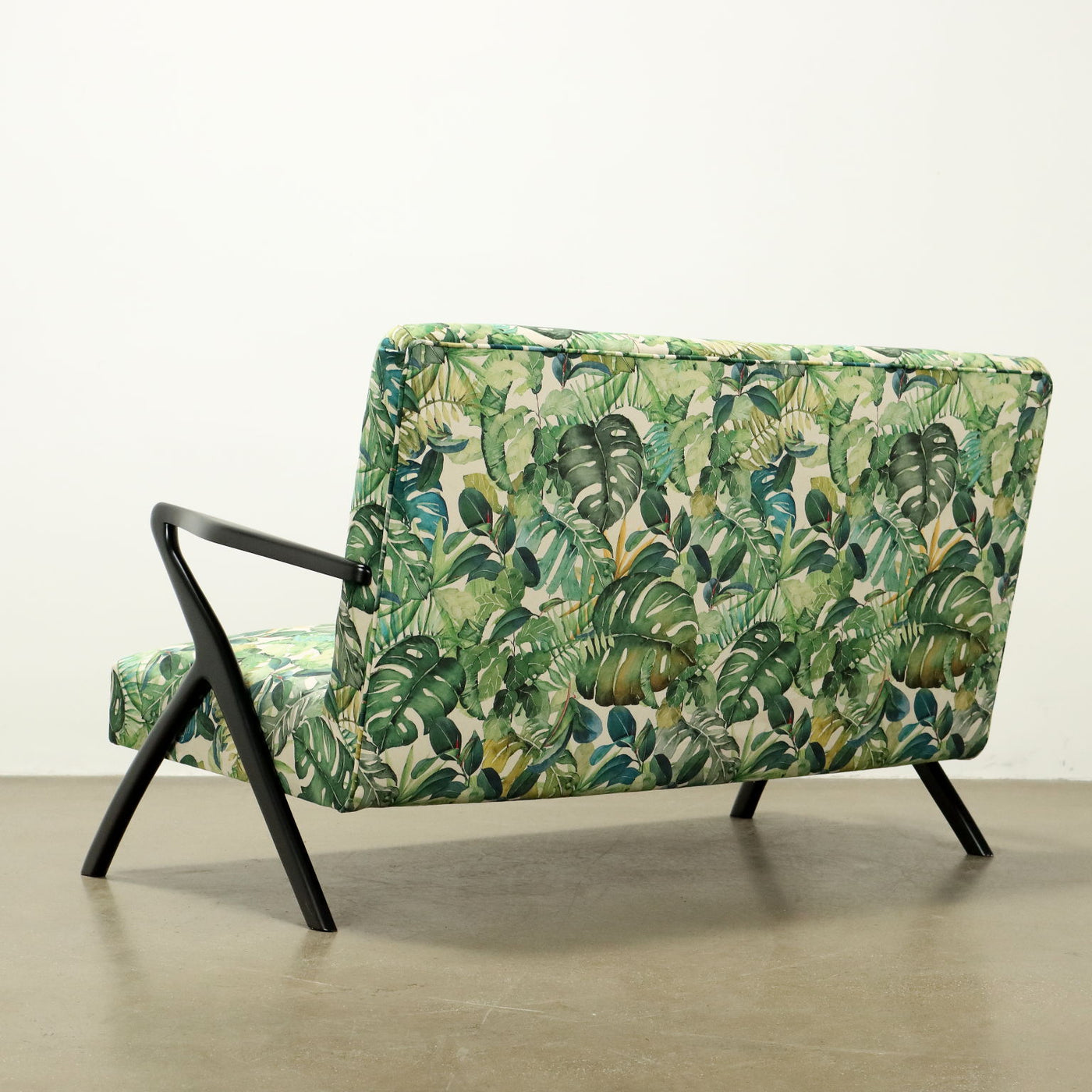 Vintage two-seater sofa made in Italy, with lacquered wooden frame, foam and spring padding, jungle-themed velvet upholstery small soda, vintage small sofa, 1980s sofa, 1970s sofa, 1960s sofa, 1950s sofa, 1940s sofa, vintage sofa, design sofa.