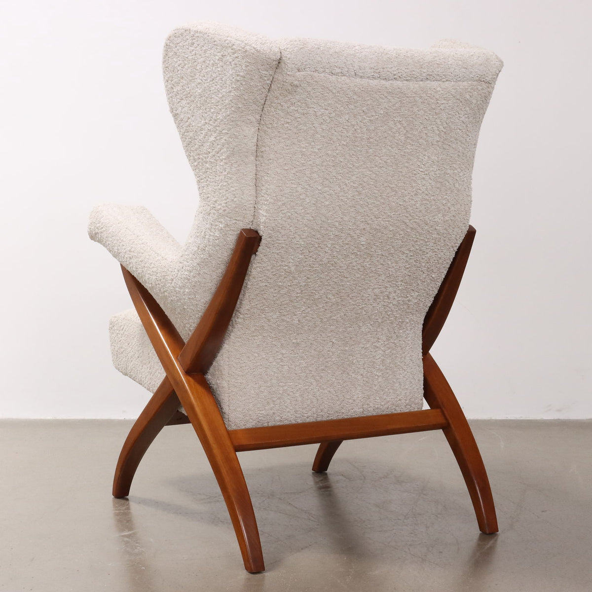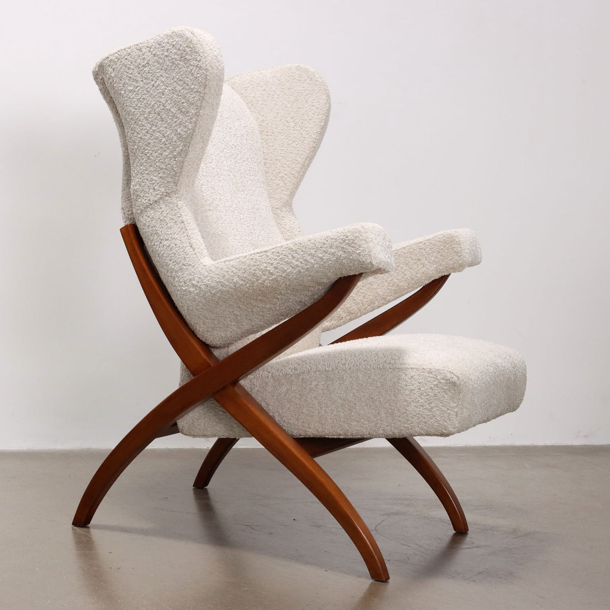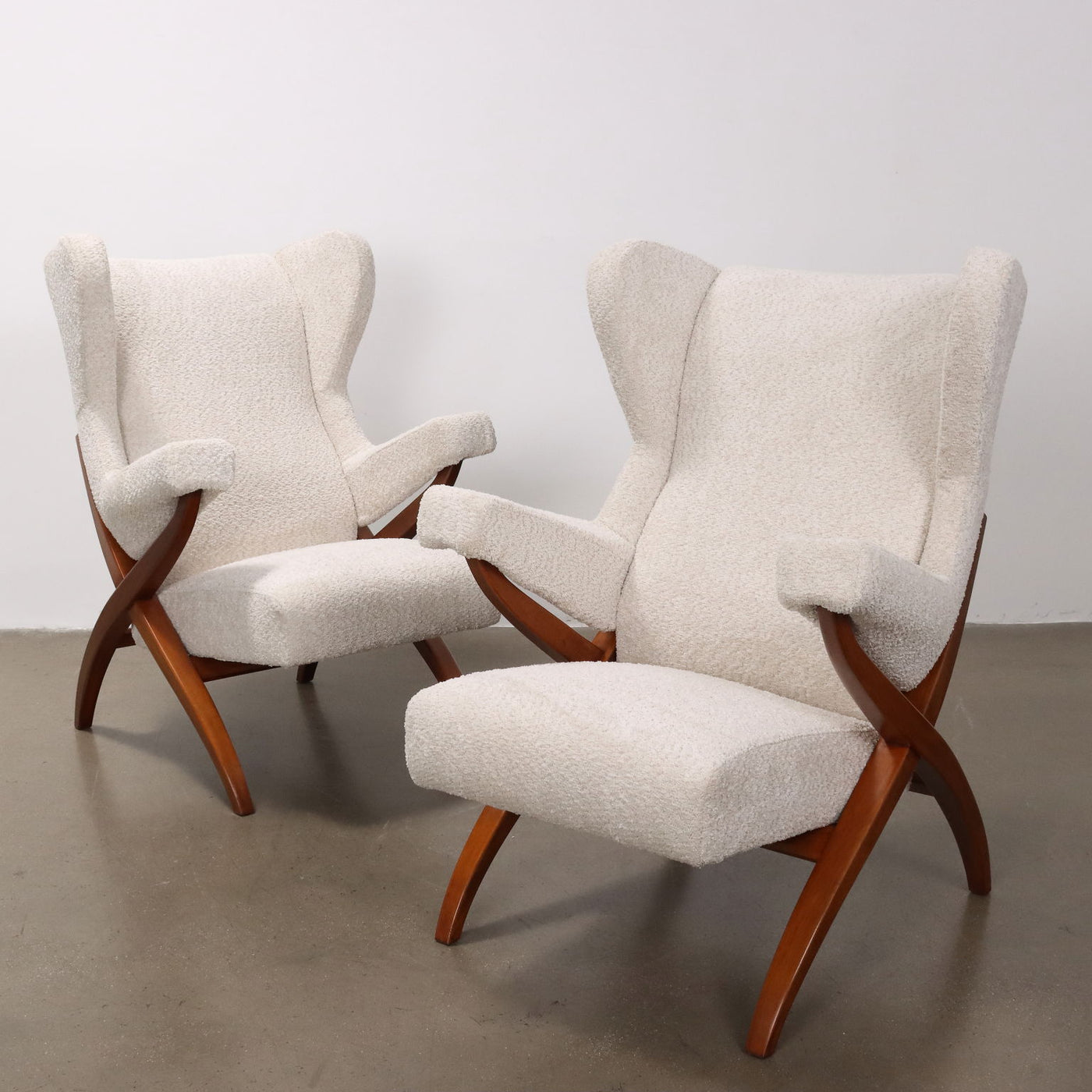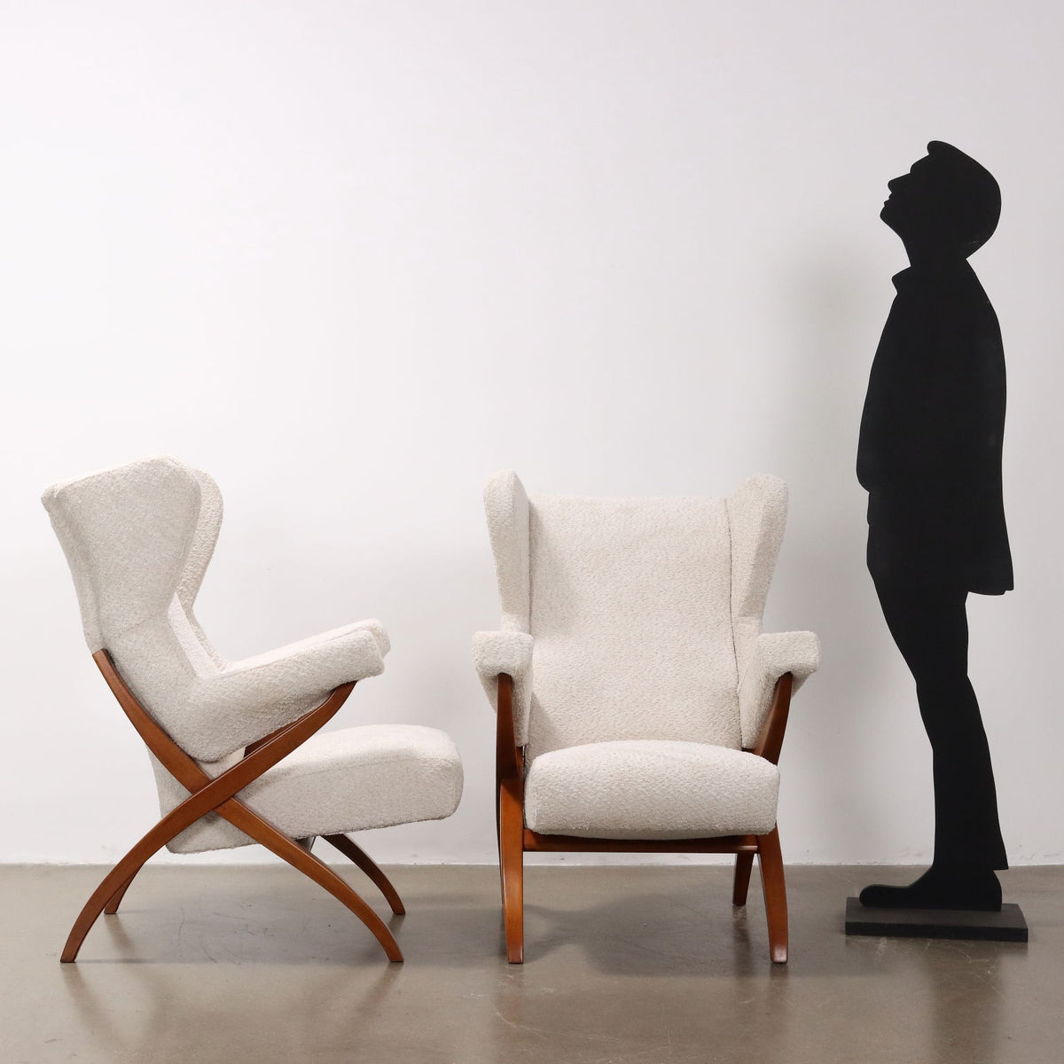 Pair of armchairs, iconic model by Franco Albini, with exposed structure in stained beech wood, foam padding, fabric covering. Very good condition, completely restored both in the wooden part and in the remaking of the padding and covering. Vintage Armchair, small armchairs, 1970s armchair, 1960s armchair, 1950s armchair, 1940s armchair, 1930s armchair, vintage armchair, design armchair, chaise lounge, office's armchair, bergère .