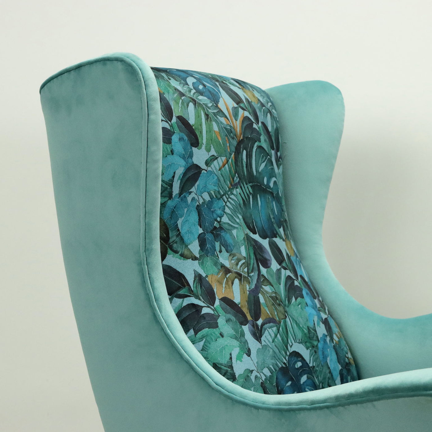Vintage armchairs of Italian manufacture, with conical brass legs, foam padding and jungle-themed velvet upholstery. Vintage Armchair, small armchairs, 1970s armchair, 1960s armchair, 1950s armchair, 1940s armchair, 1930s armchair, vintage armchair, design armchair, chaise lounge, office's armchair, bergère .