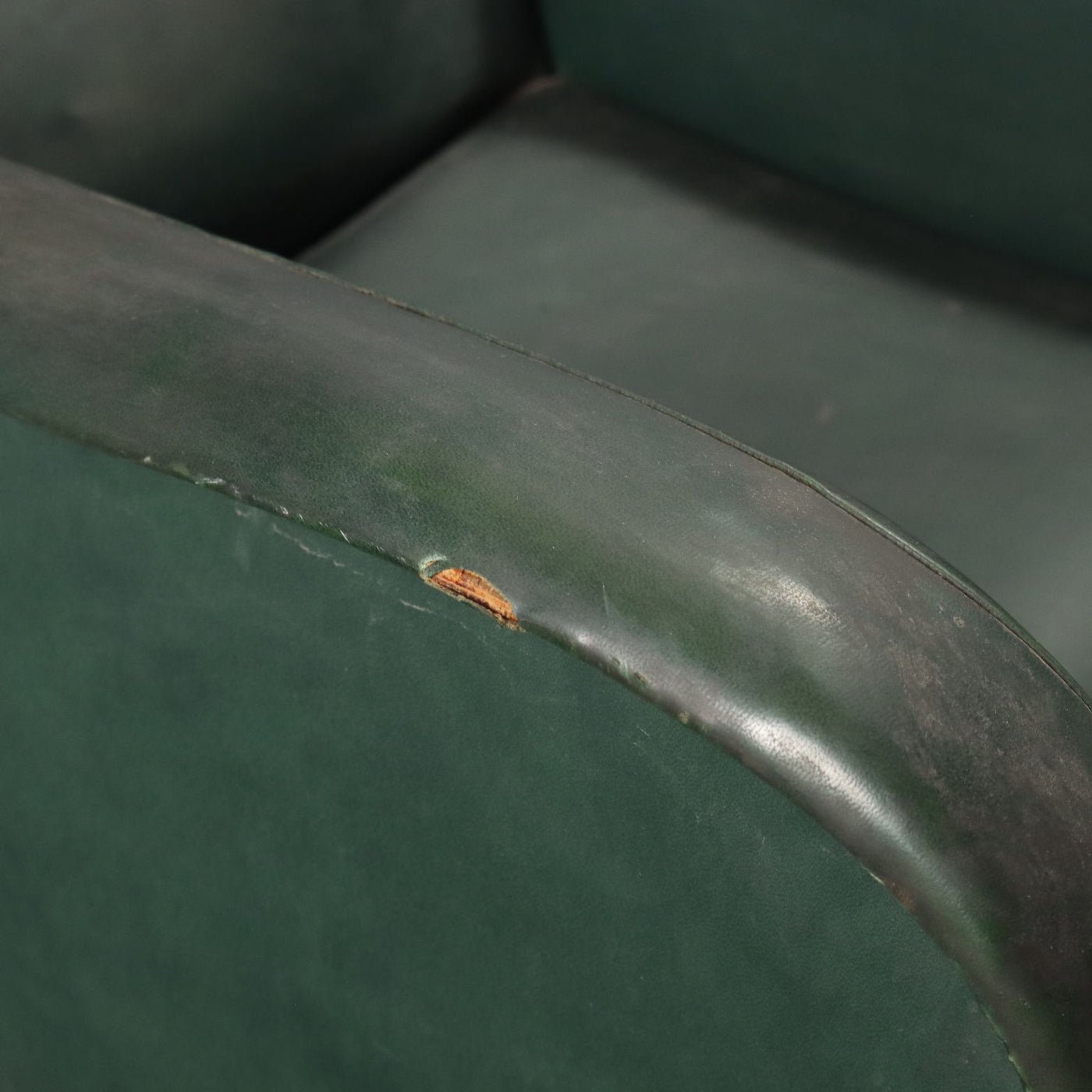 Pair of vintage armchairs of Italian manufacture from the 1950s in the style of the famous 'Lady' designed by Marco Zanuso with upholstery in green and brown imitation leather, original from the period, and metal legs. Seats that lend themselves to being refurbished with expert upholstery work, choosing from the numerous fabrics available in our warehouses. Vintage Armchair, small armchairs, 1970s armchair, 1960s armchair, 1950s armchair, 1940s armchair, 1930s armchair, vintage armchair, design armchair, chaise lounge, office's armchair, bergère .
