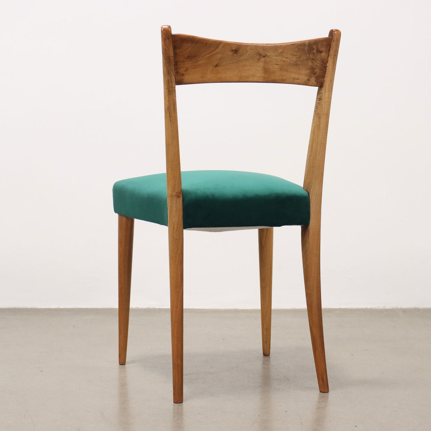 Set of four vintage dining chairs made in Italy with beech wood frame, seat with spring padding and emerald green fabric upholstery. Design Chair, 1970s chair, 1960s chair, 1950s chair, 1940s chair, vintage chair, design chairs, office chair.