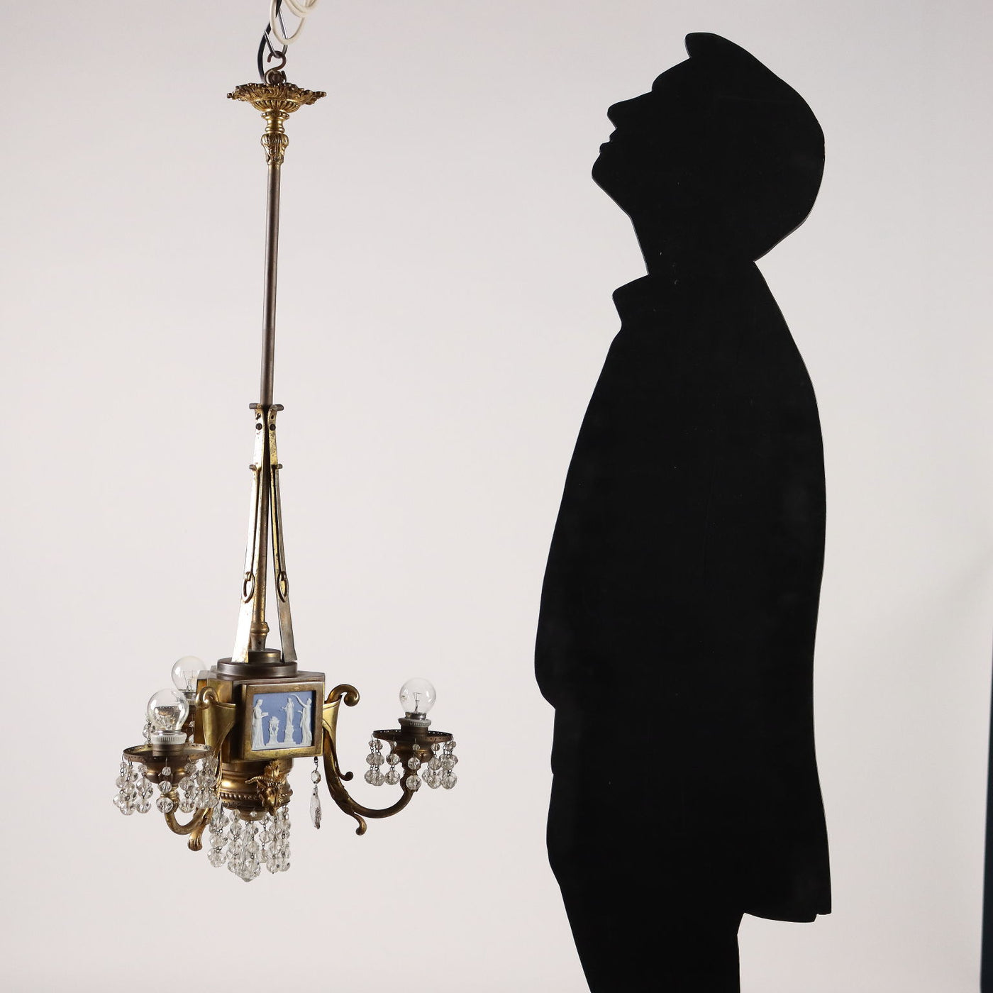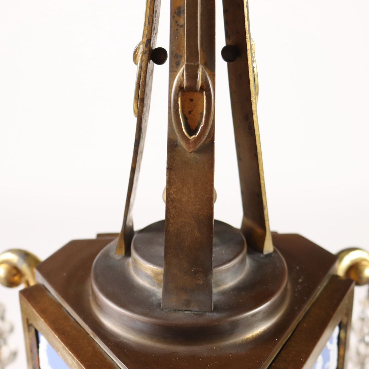 3-light gilt bronze chandelier with wedgwood ceramic inserts, England late 19th - early 20th century. Glass pendants. Ceiling lamp, oil lamp, lantern, chandelier, ceiling lamp.