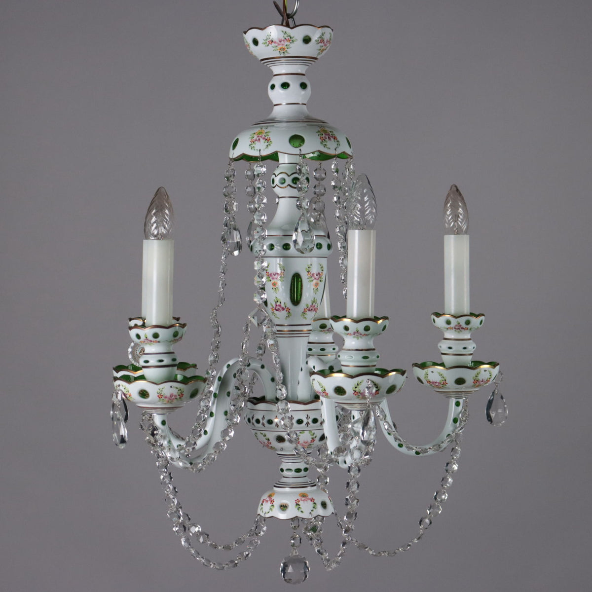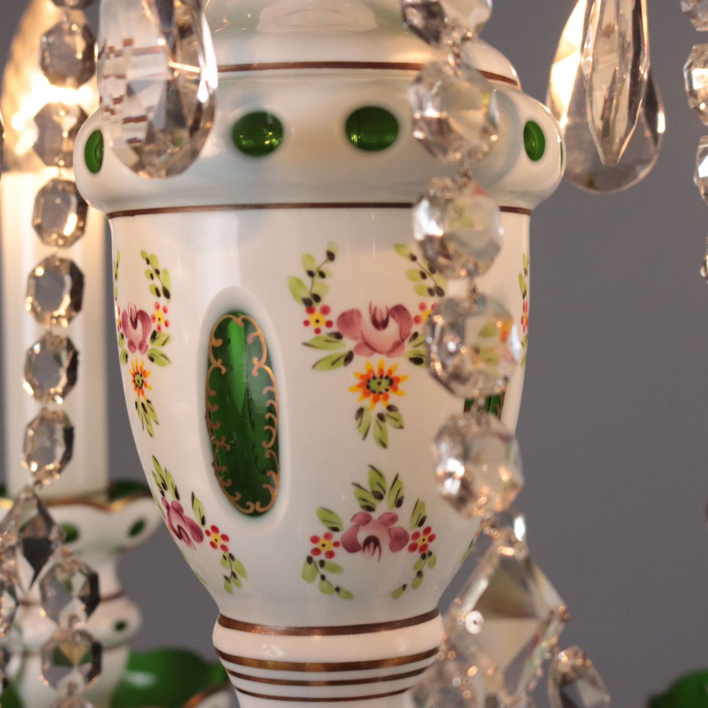 Five-light chandelier in milky Bohemian glass painted with floral motifs; it is adorned with glass pendants and necklaces. Ceiling lamp, oil lamp, lantern, chandelier, ceiling lamp.