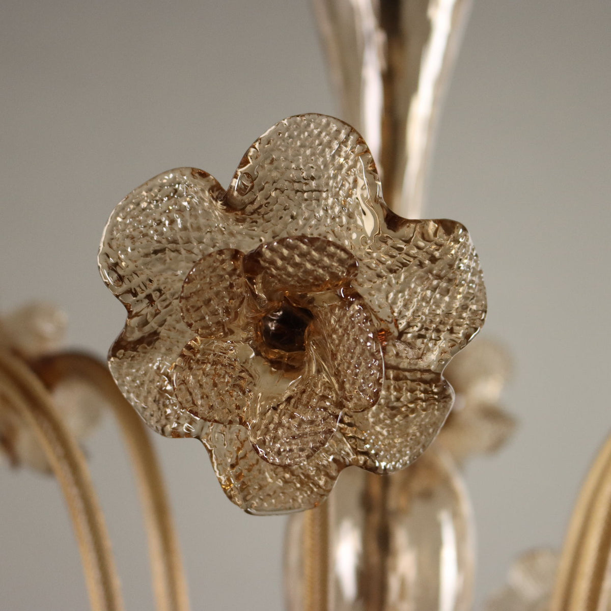 Murano chandelier from the 1950s in smoked glass; six lights with typical glass in the shape of leaves and flowers, small losses and chips. Ceiling lamp, oil lamp, lantern, chandelier, ceiling lamp.
