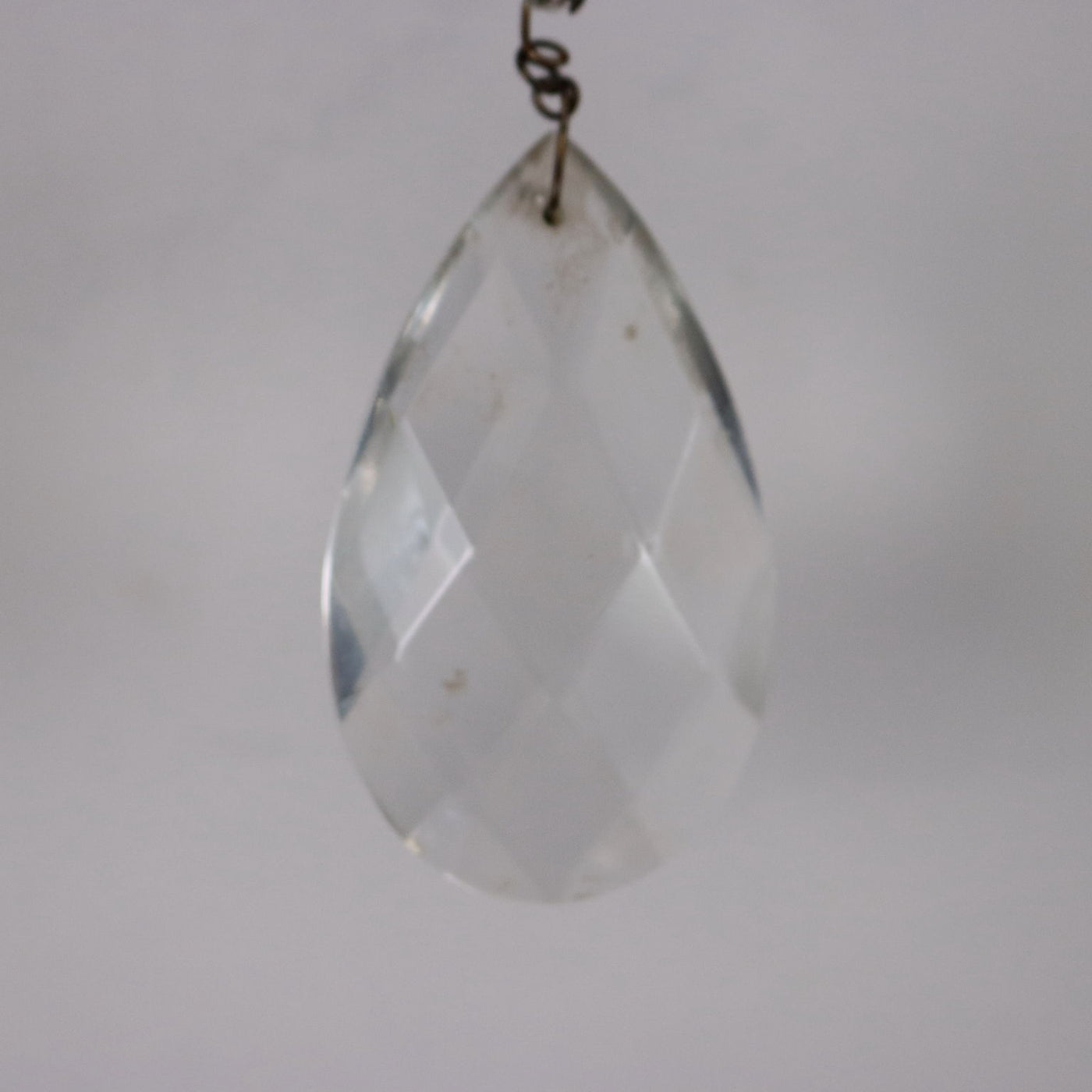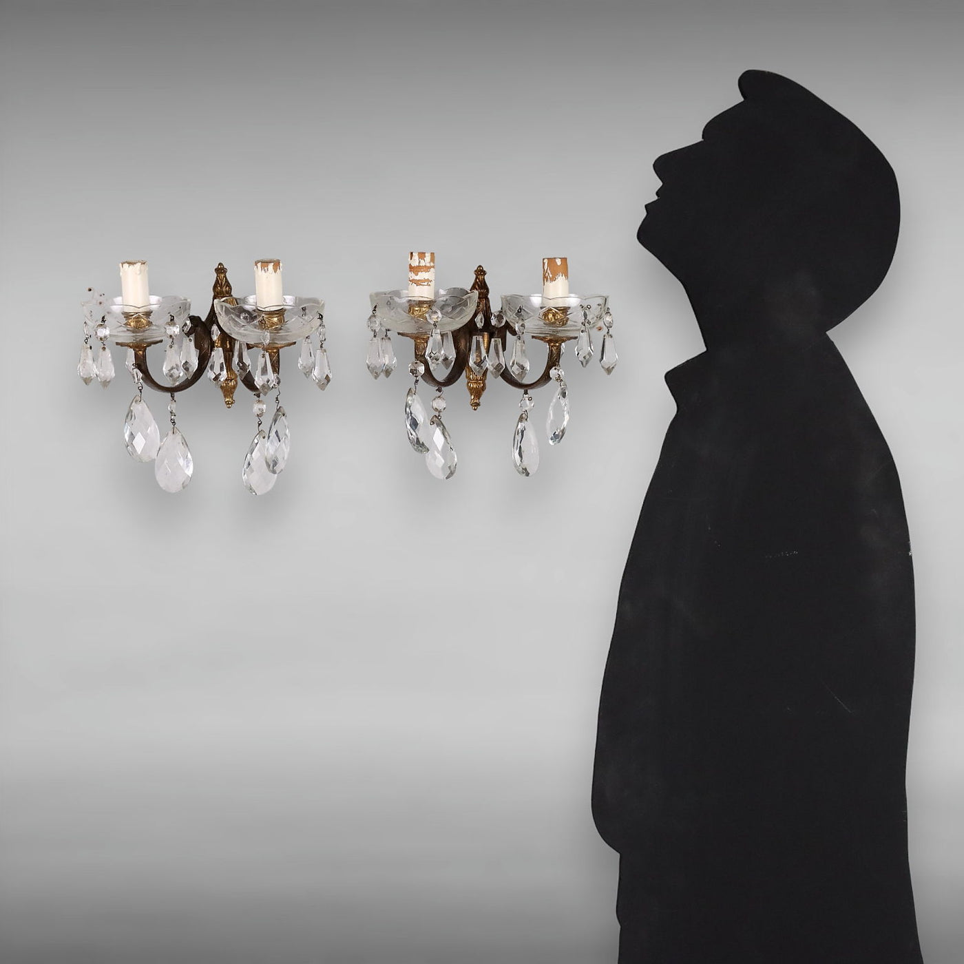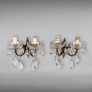 Pair of two-light gilded bronze appliques, Italy, 20th century. Bobeches and glass pendants. Wall lamp.