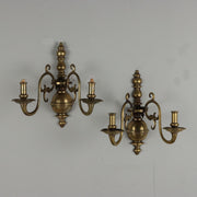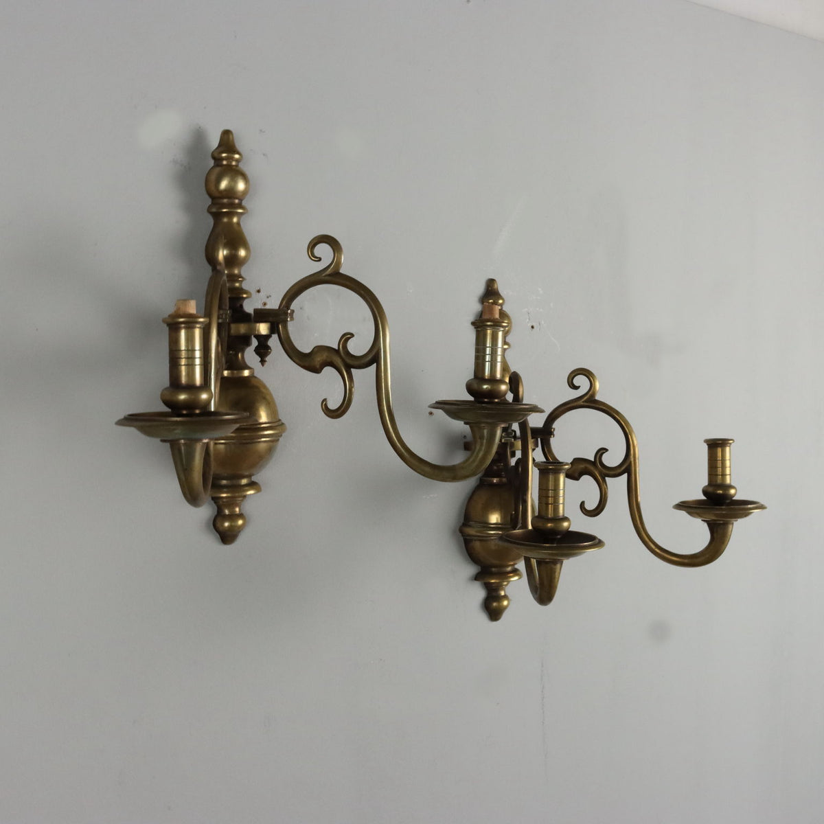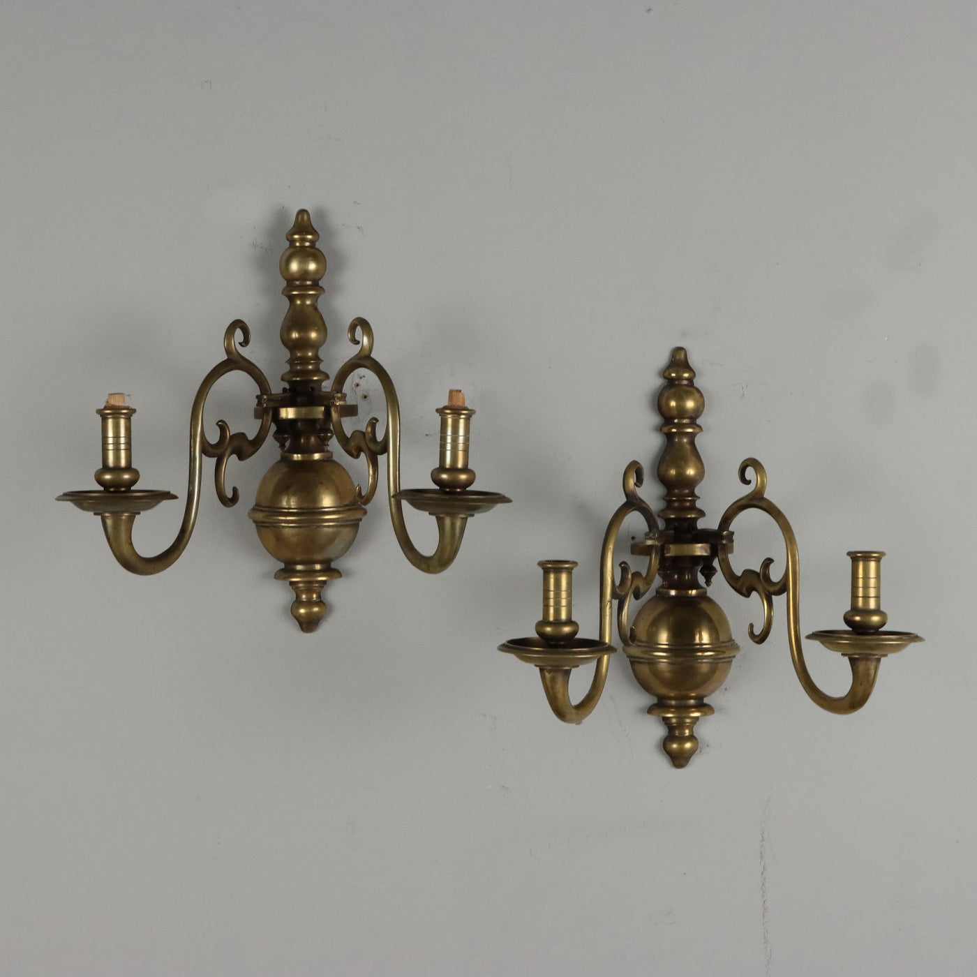 Pair of two-light Bronze wall lamps in Dutch Baroque style, Northern Europe, early 20th century. Turned shaft with sphere in the lower section, wavy arms decorated with curls. Wall lamp.