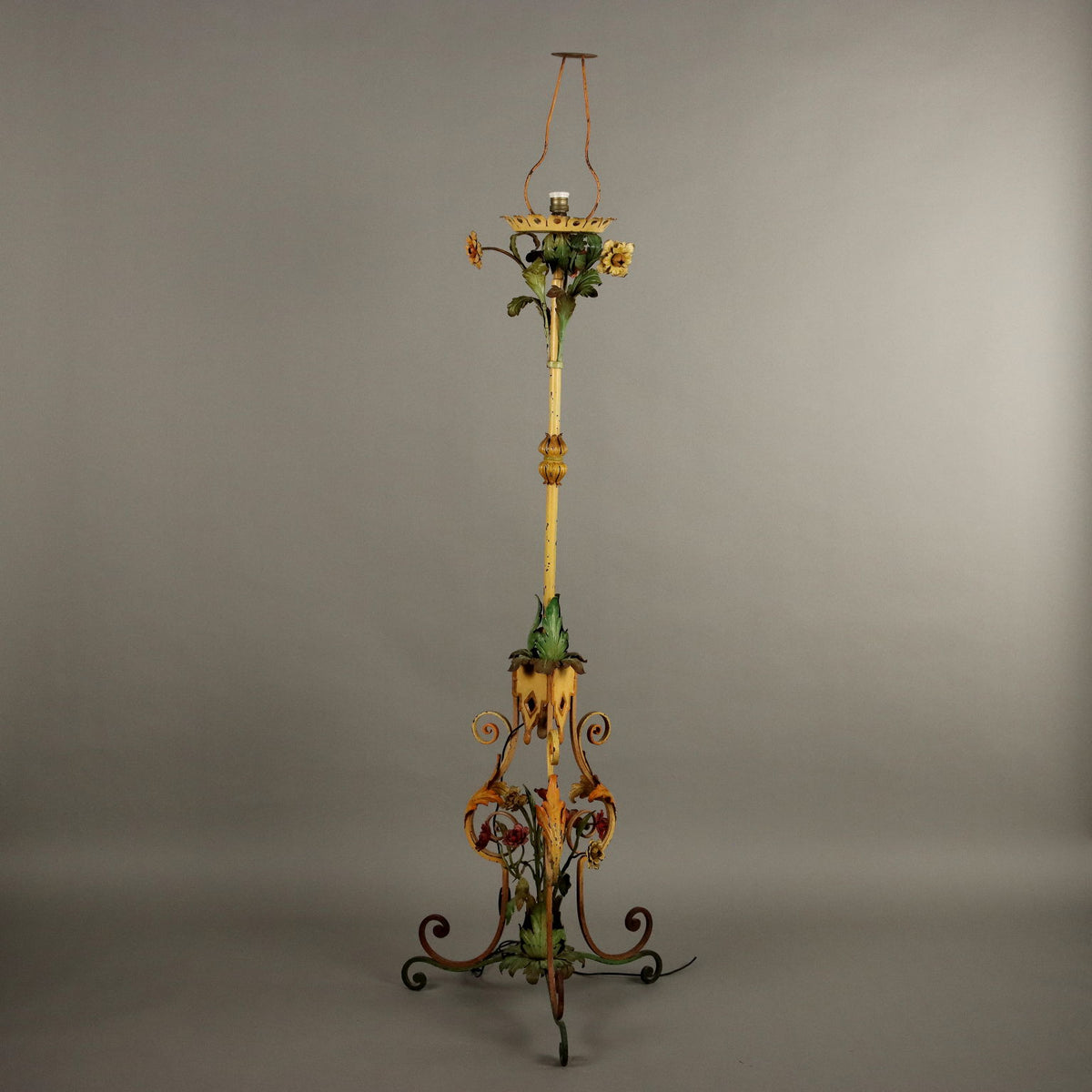 Wrought iron torch holder resting on a tripod base, the structure is decorated with leaf, phytomorphic and floral motifs; entirely lacquered and painted. Floor lamp, torch-holder, candle-holder, candlestick.