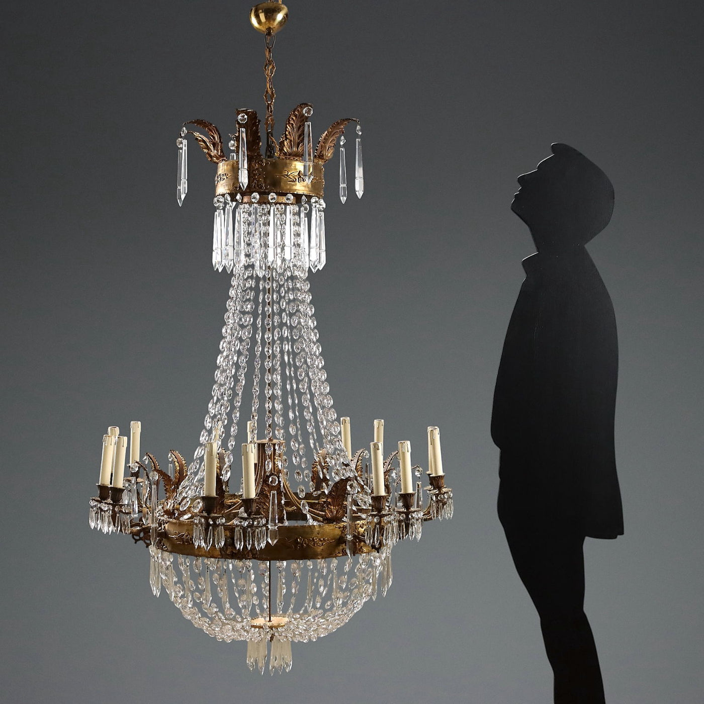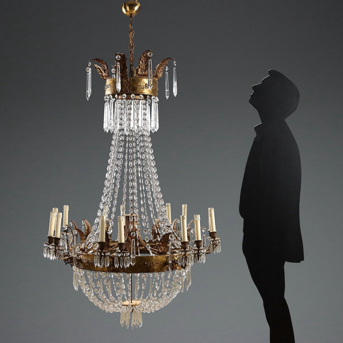 Balloon-shaped chandelier in metal and sheet metal worked in repoussé and gilded. Sheet metal decorations that hint at the future Liberty style. Fourteen lights arranged in pairs, glass pendants and necklaces. Italy, last quarter of the 19th century. Ceiling lamp, oil lamp, lantern, chandelier, ceiling lamp.