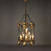 Large lantern of lacquered iron and glass with octagonal cross-section, embellished with leaf decorations in gilded sheet metal. Fourteen-light central body in wrought iron, bobeche and leafy decorations in gilt sheet metal. Italy, early 20th century. Ceiling lamp, oil lamp, lantern, chandelier, ceiling lamp.