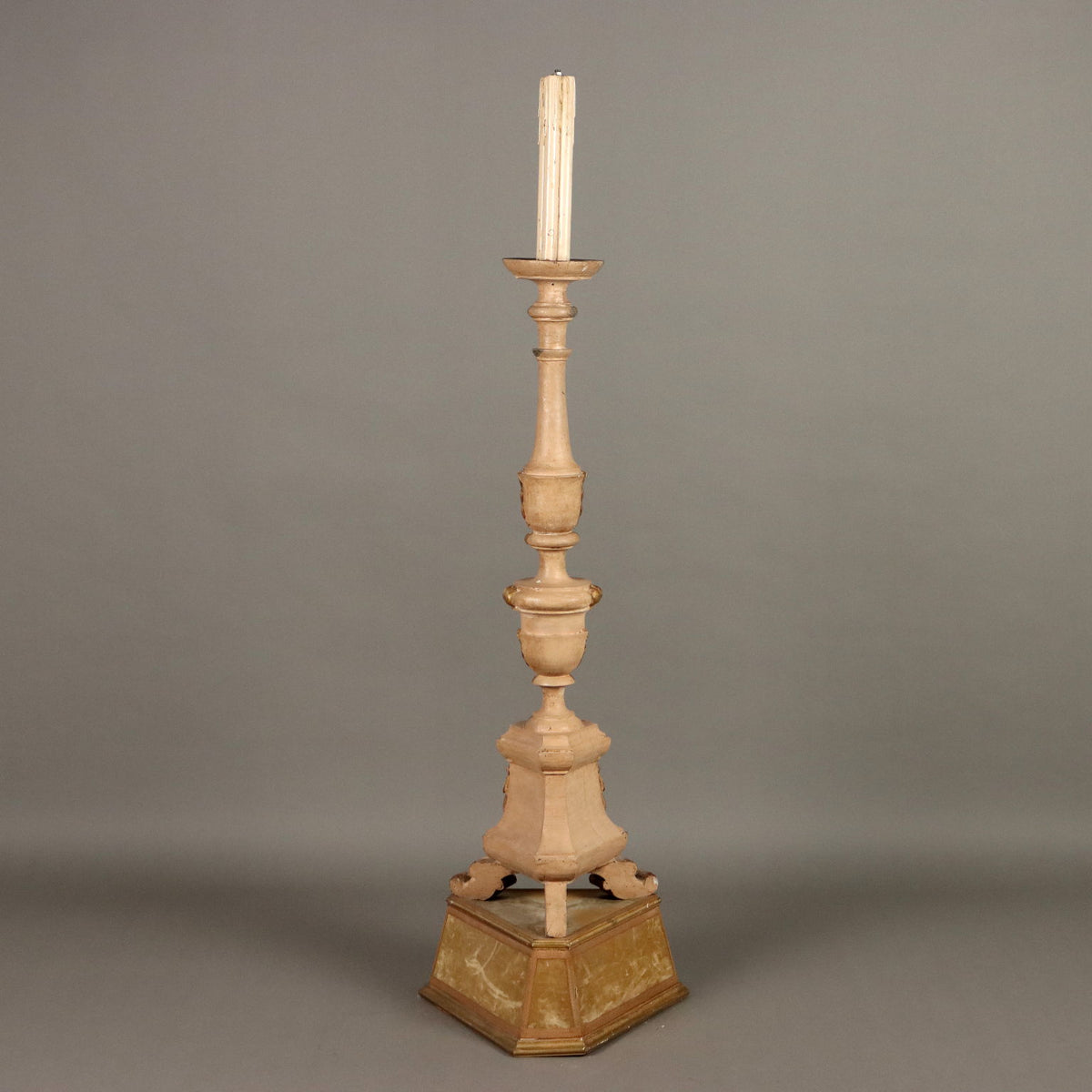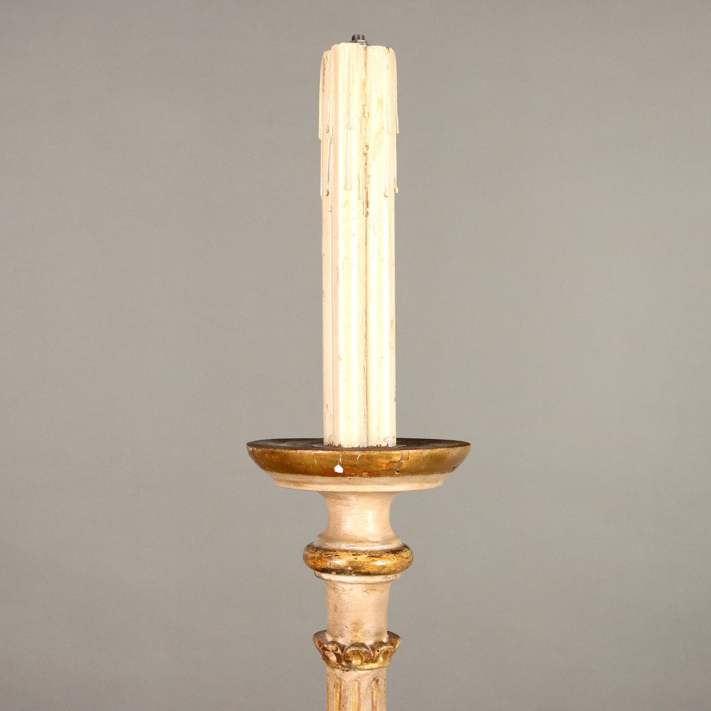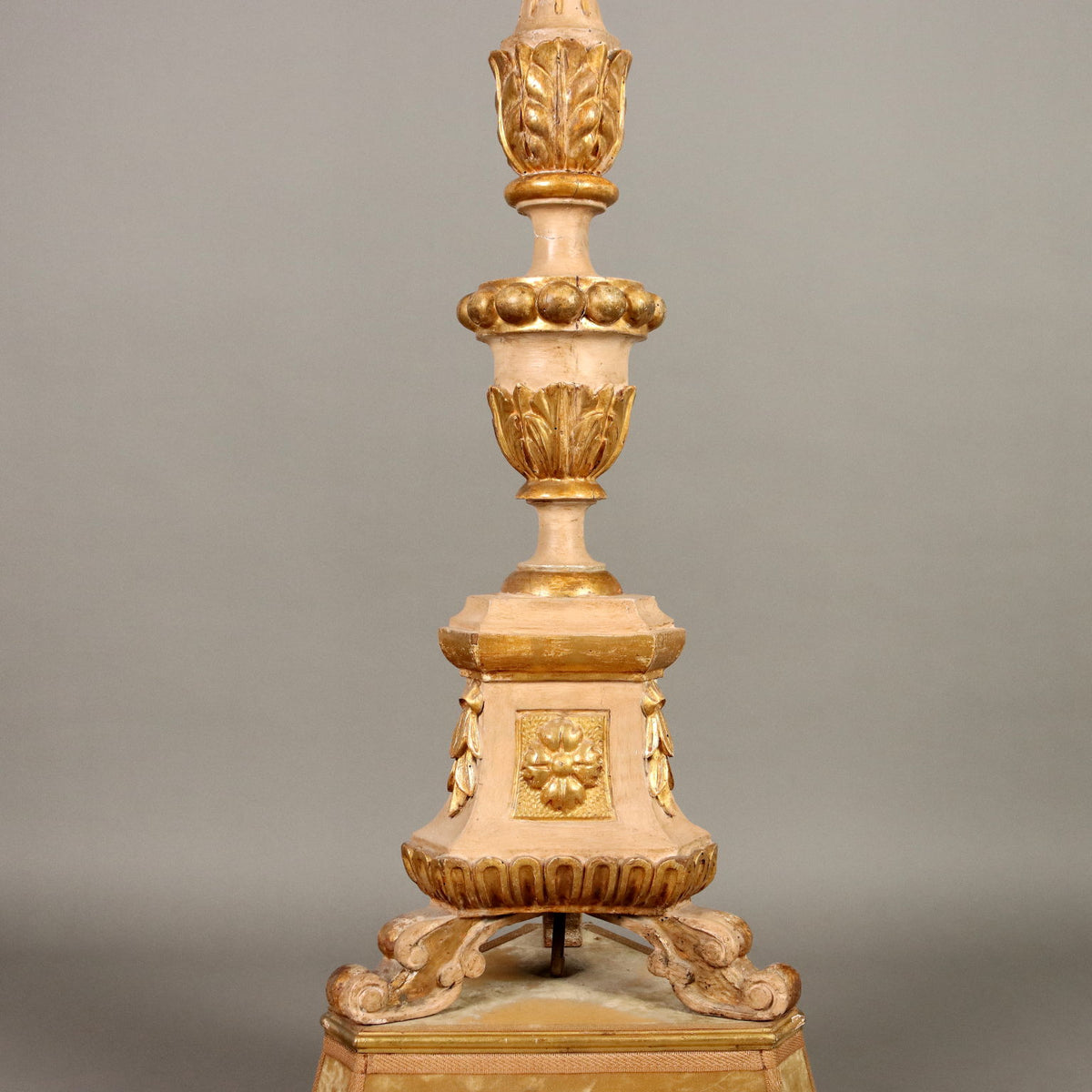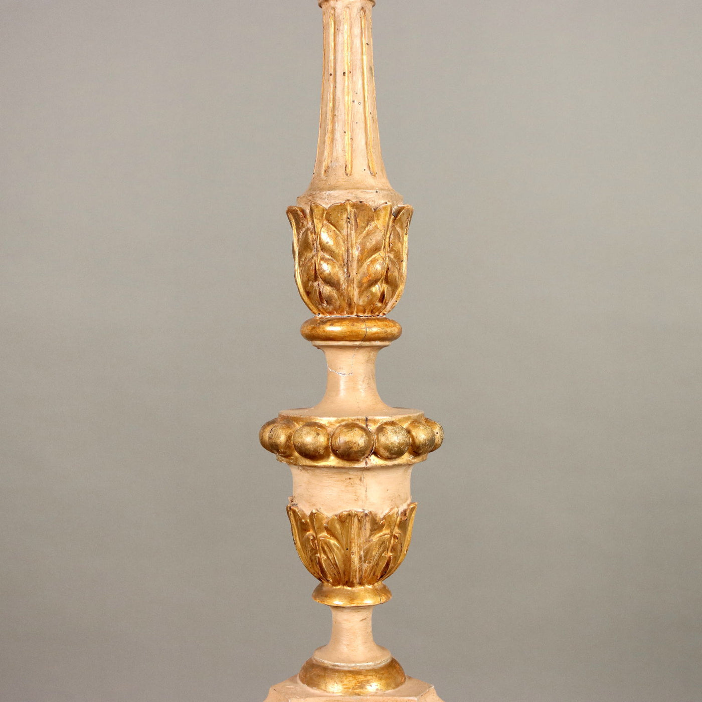 Candelabra in carved, lacquered and gilded wood, resting on a posthumous base in gilded wood and velvet. Italy, second half of the 19th century. Floor lamp, torch-holder, candle-holder, candlestick.