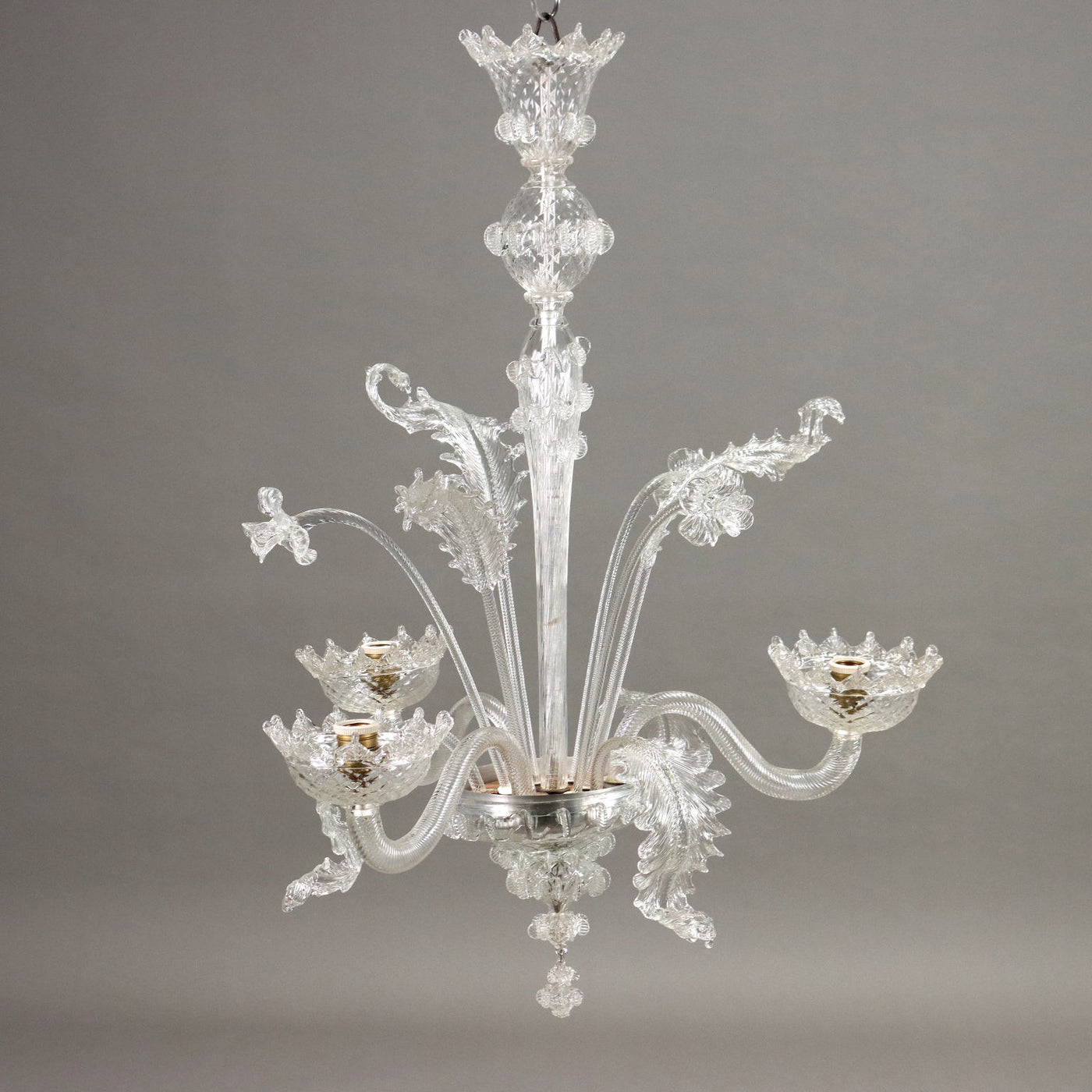 Venetian blown glass chandelier with three lights supported by wavy arms, central stem adorned with leaves, flowers and pendants. Italy, early 20th century. Ceiling lamp, oil lamp, lantern, chandelier, ceiling lamp.