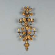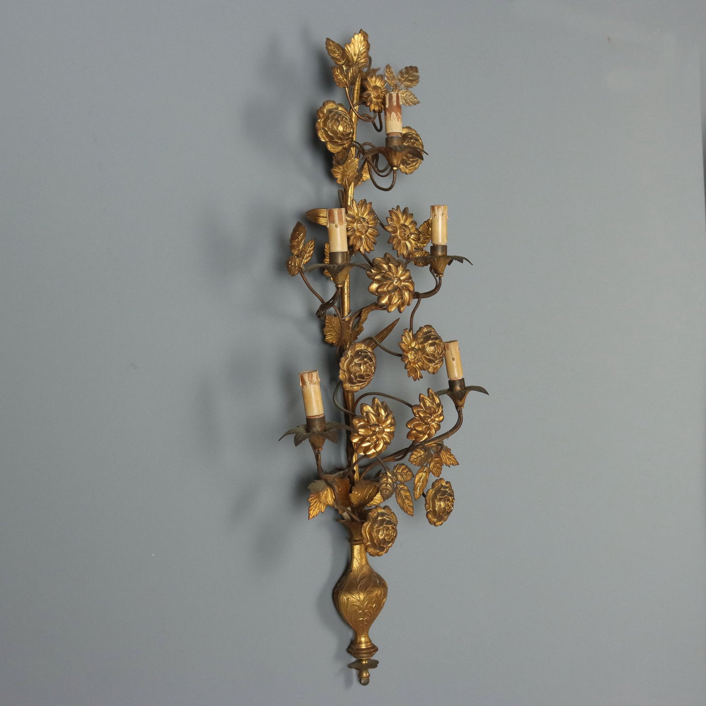 5-light wall lamp in iron and metal worked in relief with floral and leaf motifs, and gilded. Italy, early 20th century. Wall lamp.
