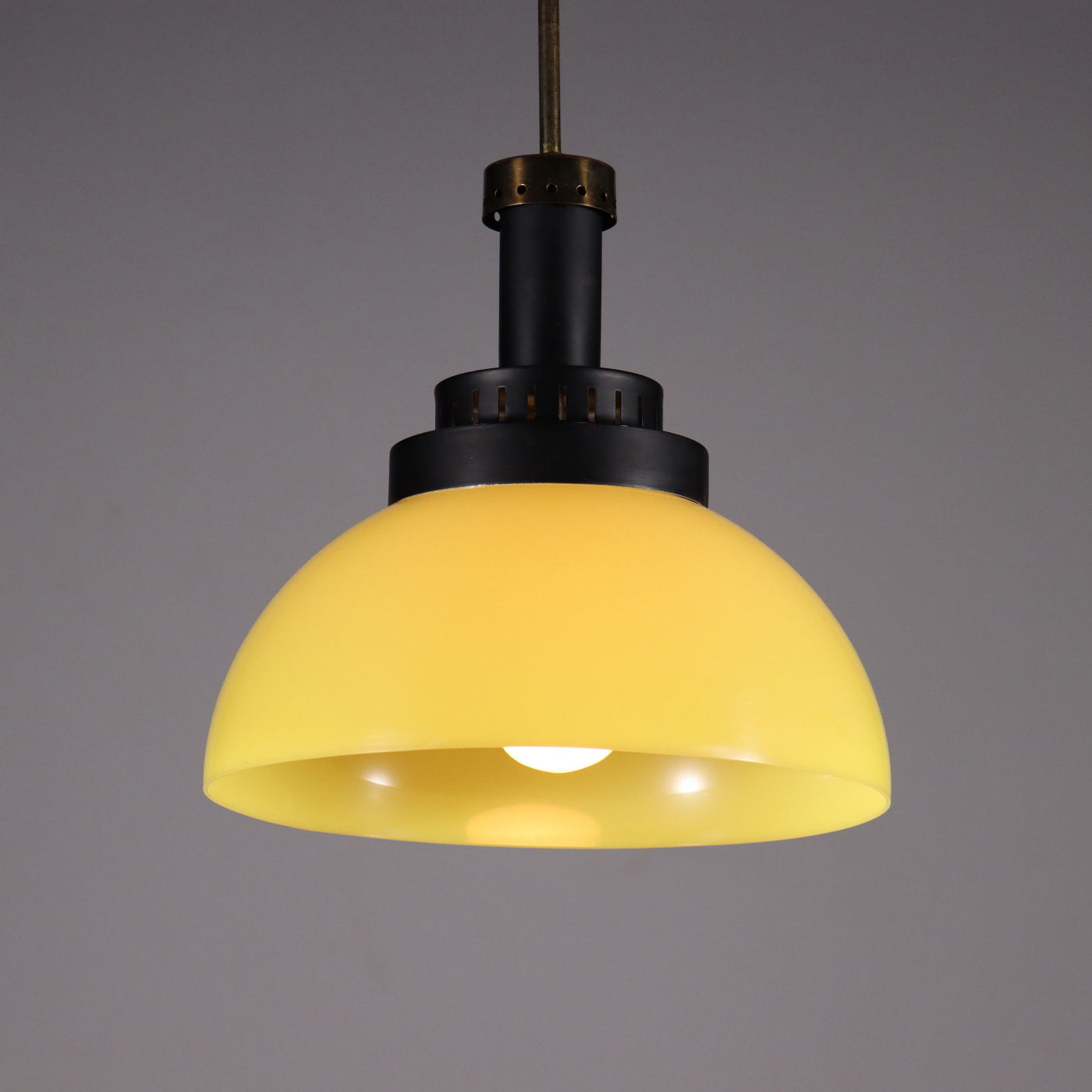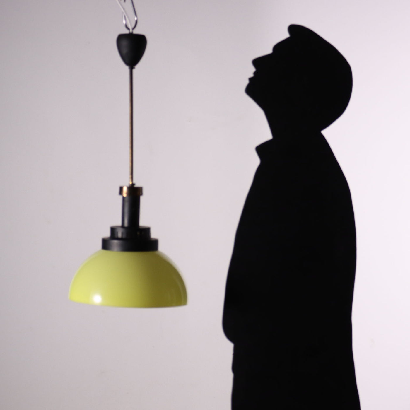 1960s ceiling lamp; enamelled aluminum, brass and methacrylate lampshade. vintage chandelier, design ceiling lamp, design chandeliers, ceiling lamp.