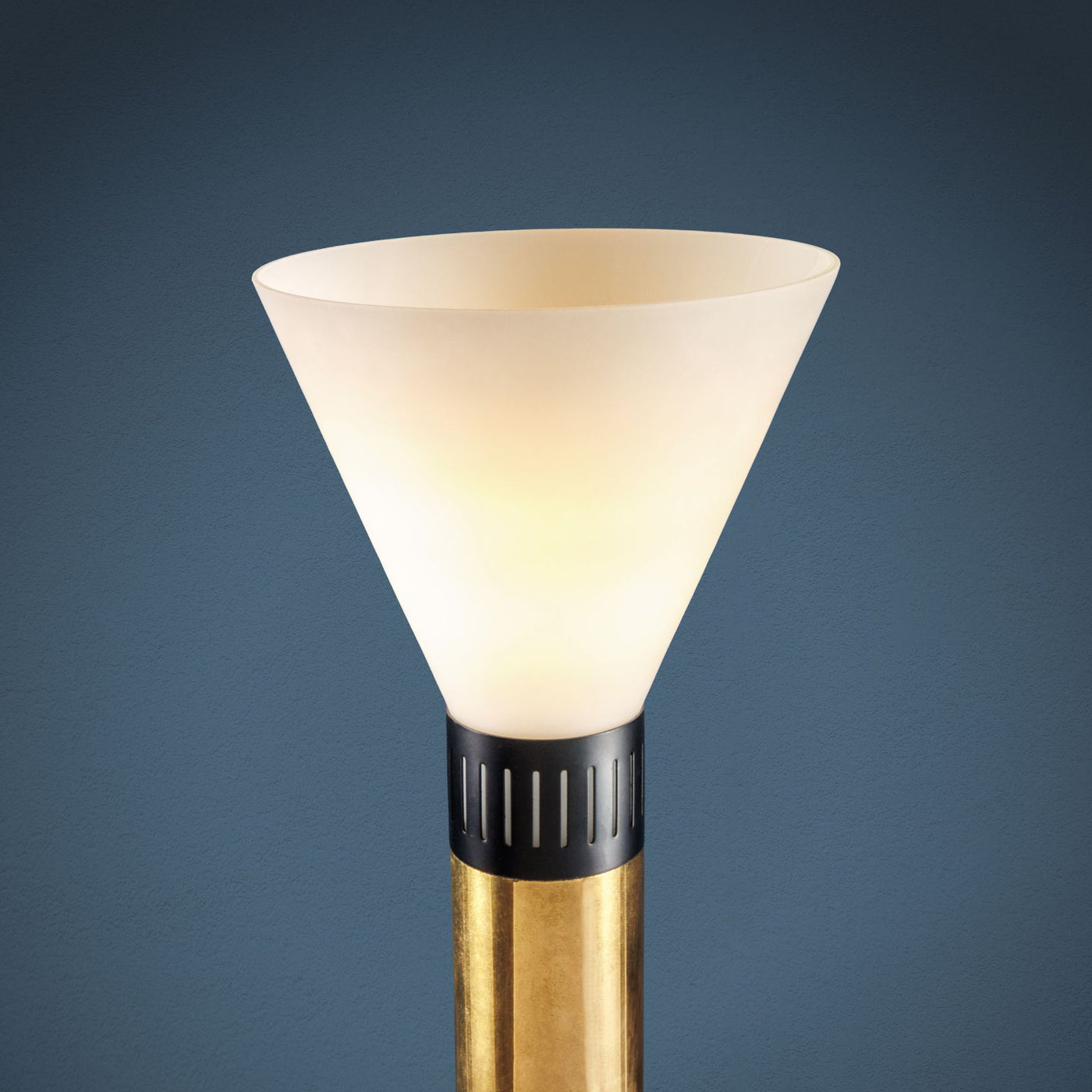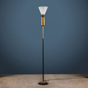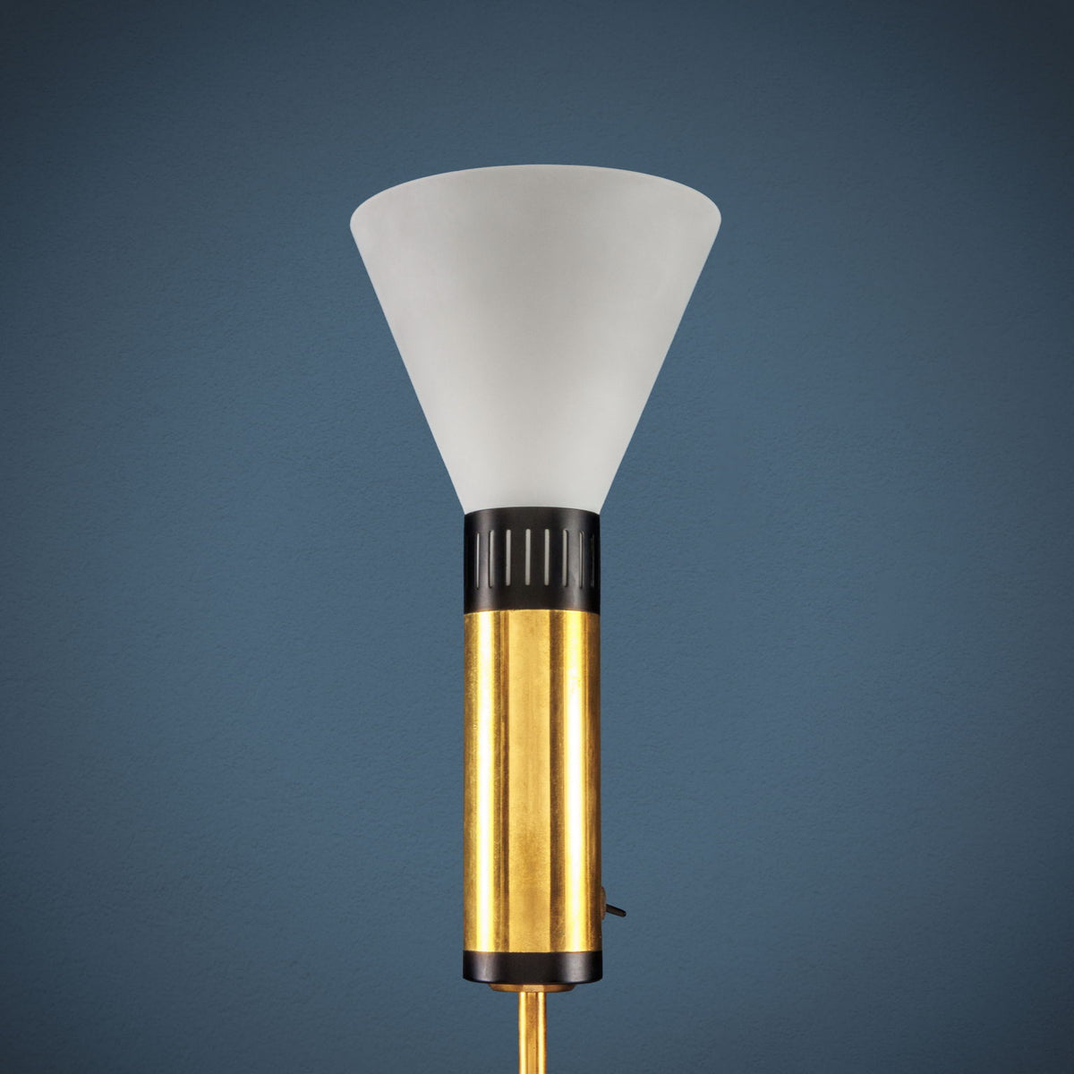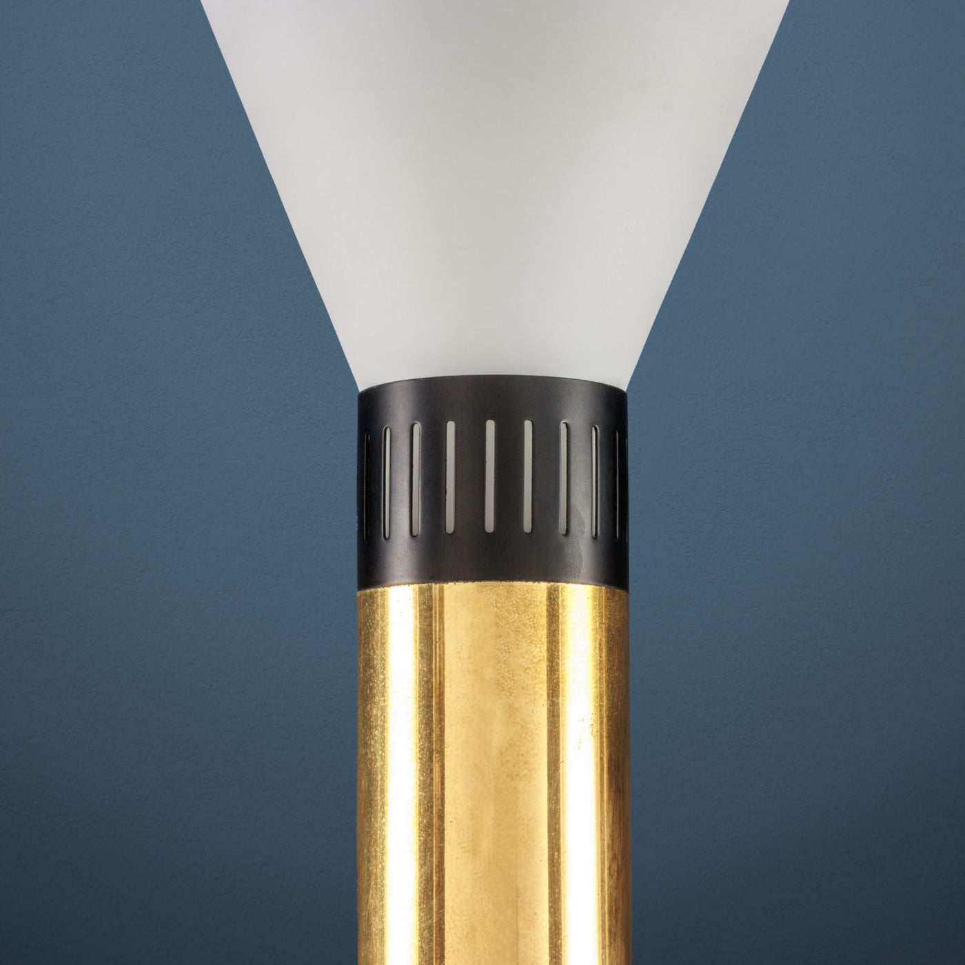 Floor lamp that incorporates a model widely used by Stilnovo in the 60s in particular in the ceiling models. Lamp with base and stem in metal and enamelled aluminium, brass, white opal glass diffuser. Design floor lamp, vintage floor lamp, 1970s floor lamp, 1960s floor lamp, 1950s floor lamp, floor lamp.