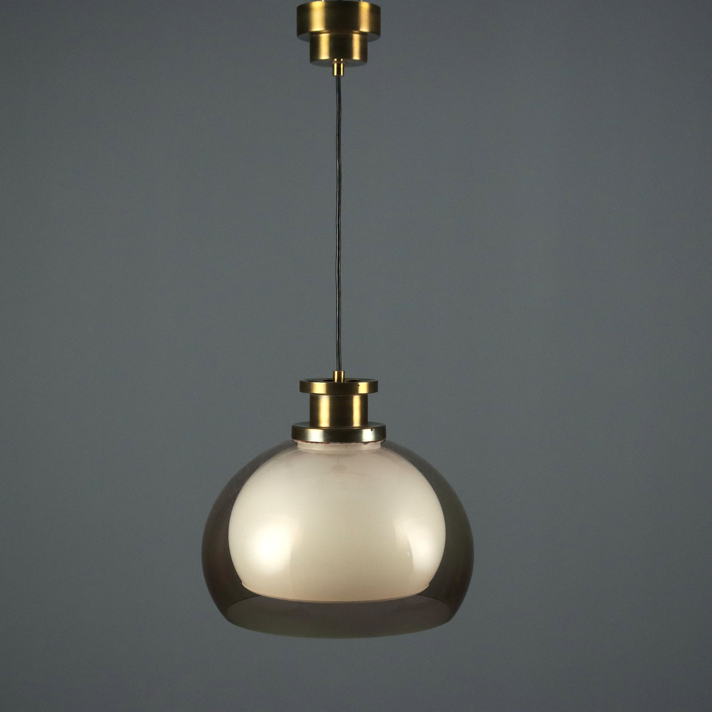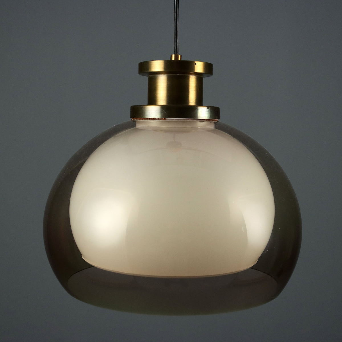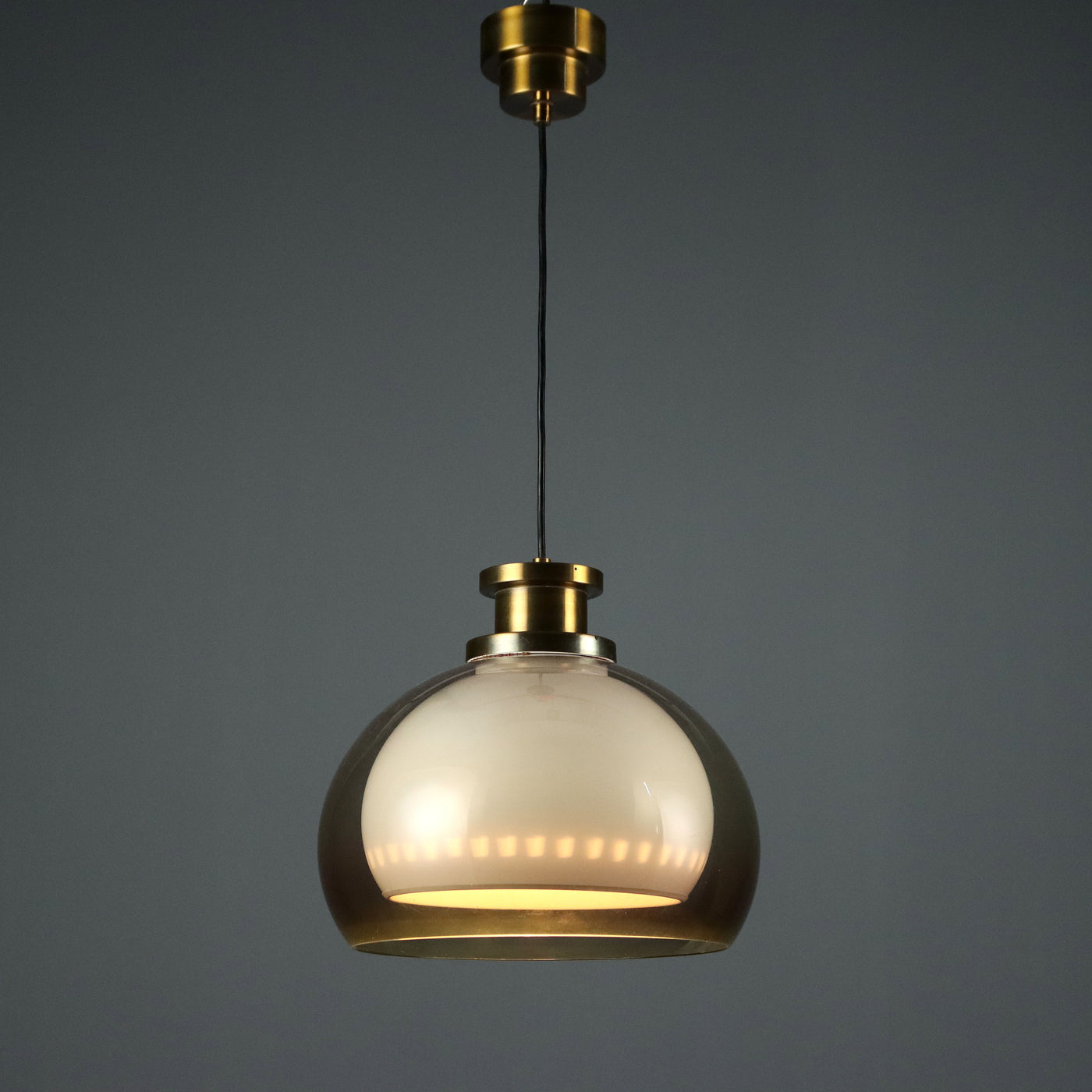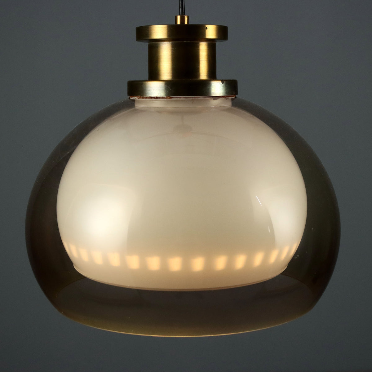 Vintage ceiling lamp of Italian manufacture from the 20th century with brass structure, double cap in transparent smoked and white methacrylate and enamelled aluminium. vintage chandelier, design ceiling lamp, design chandeliers, ceiling lamp.