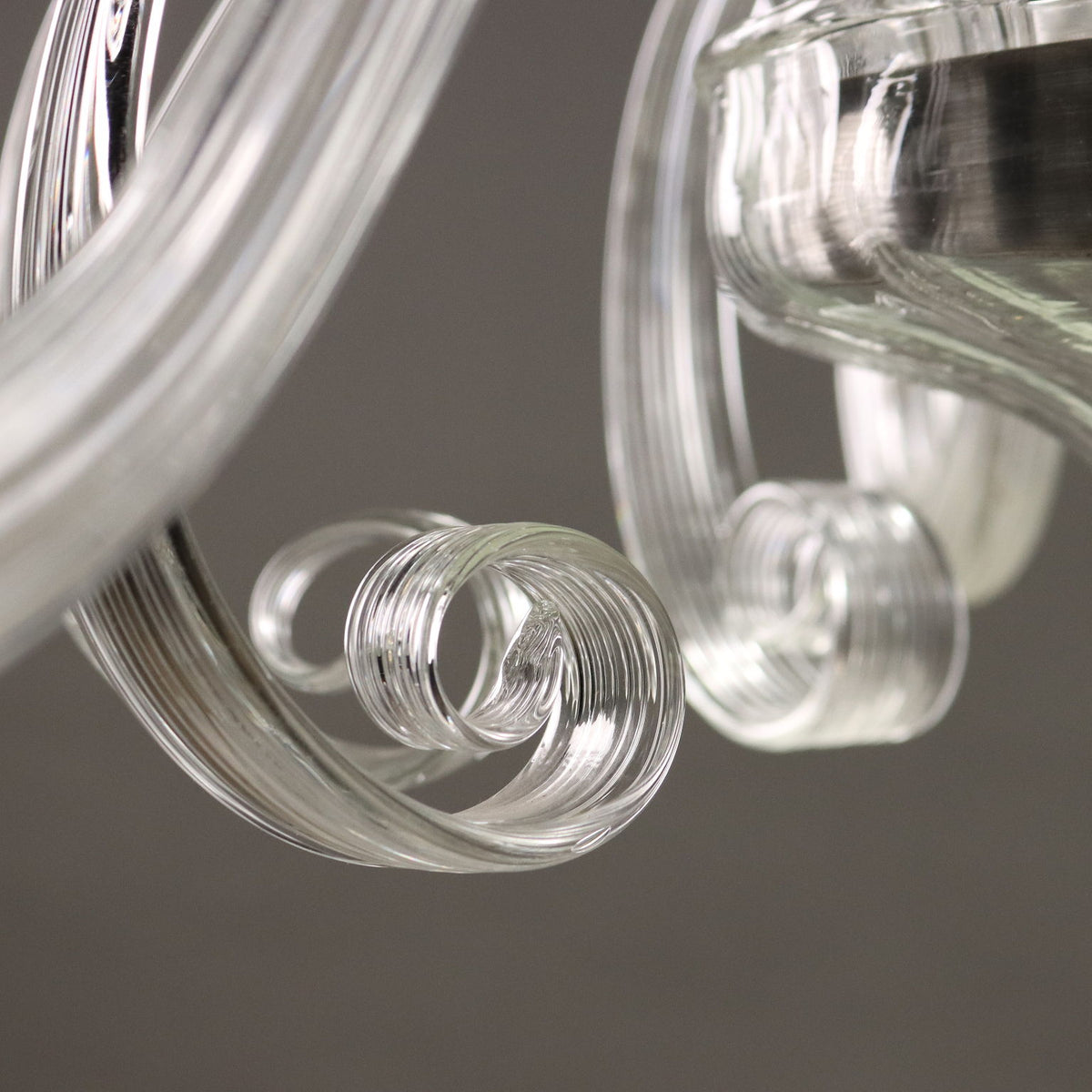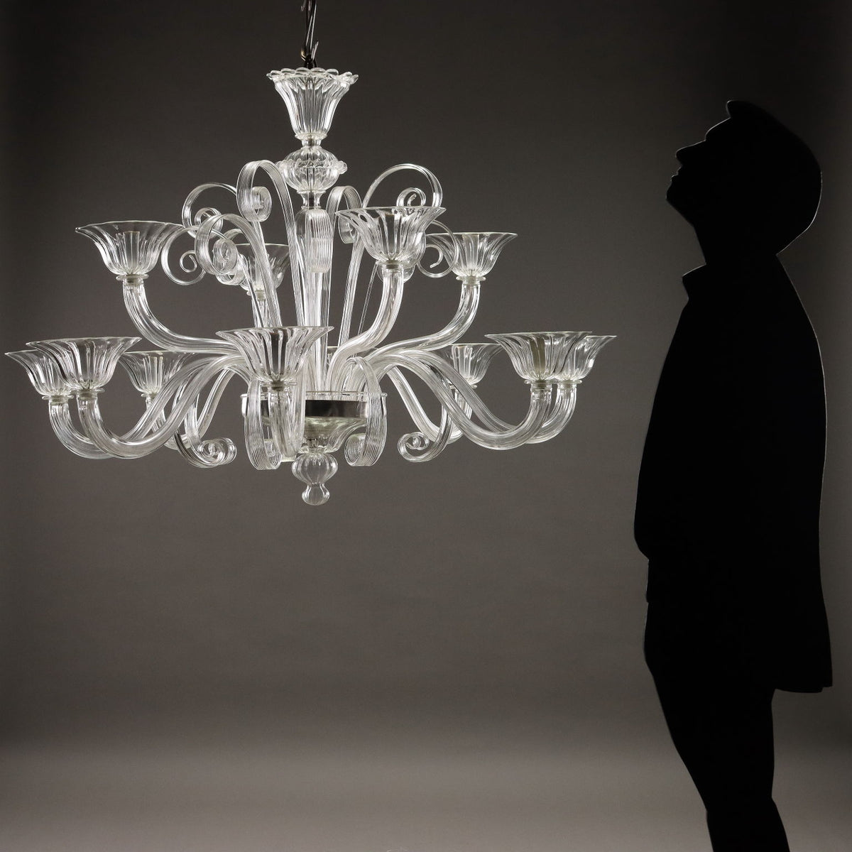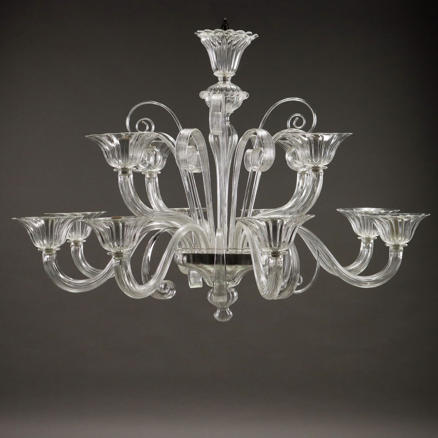 Venetian chandelier in transparent blown glass, twelve lights arranged on a double stage. Wavy arms alternating with ascending and hanging curls and volutes. Murano, 20th century. vintage chandelier, design ceiling lamp, design chandeliers, ceiling lamp.