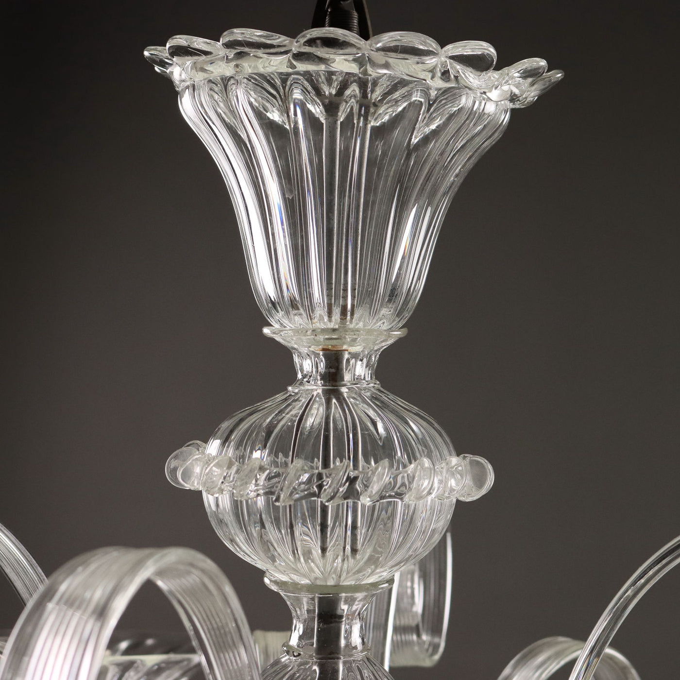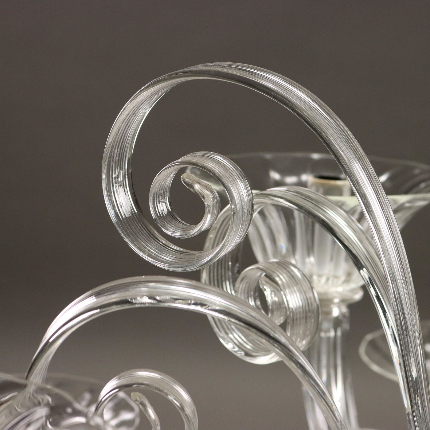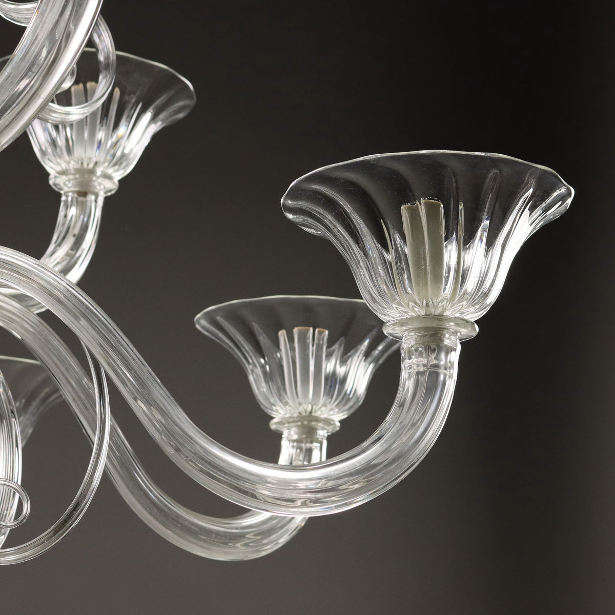 Venetian chandelier in transparent blown glass, twelve lights arranged on a double stage. Wavy arms alternating with ascending and hanging curls and volutes. Murano, 20th century. vintage chandelier, design ceiling lamp, design chandeliers, ceiling lamp.