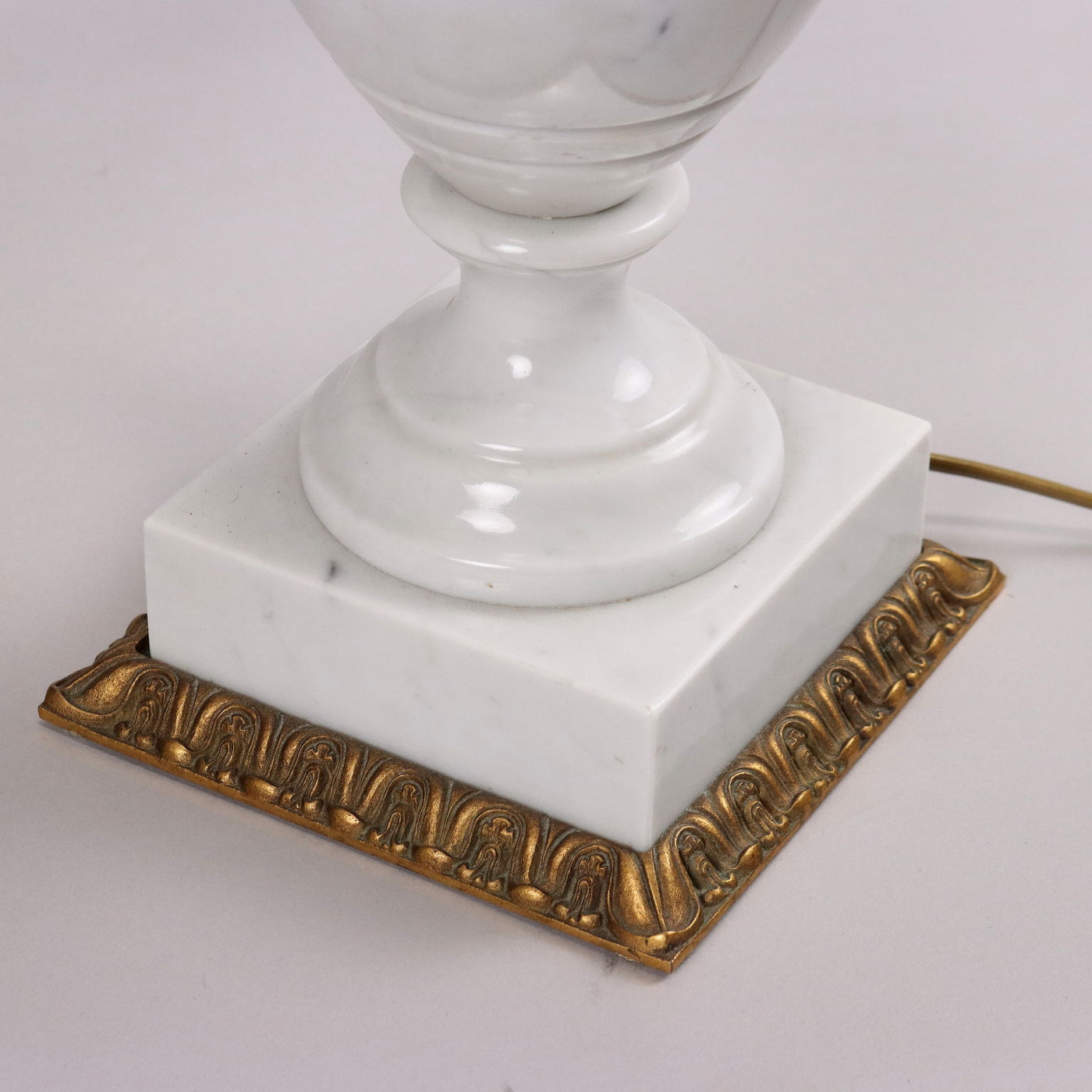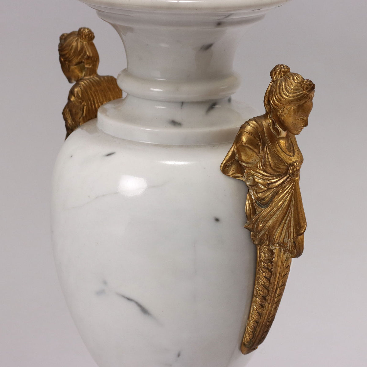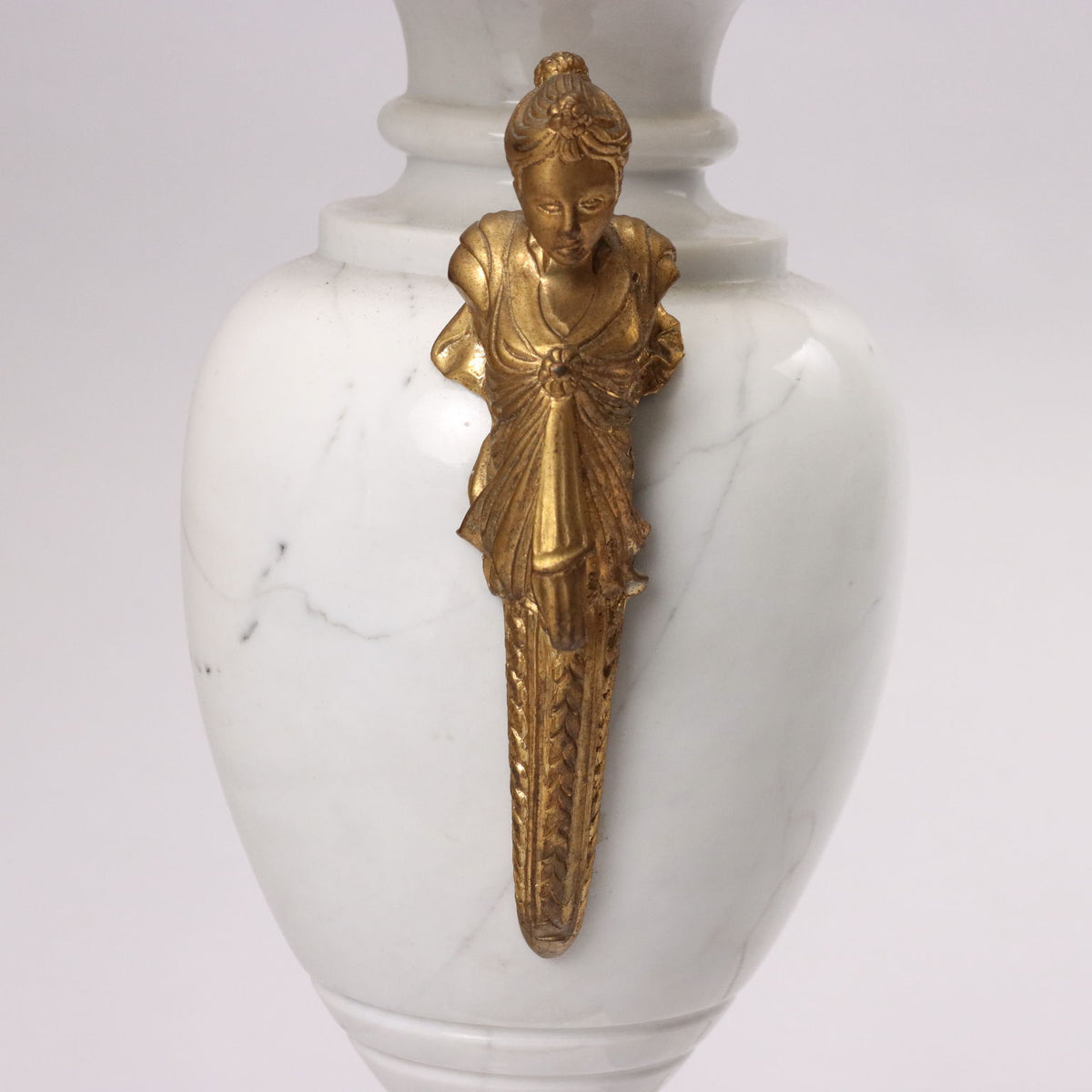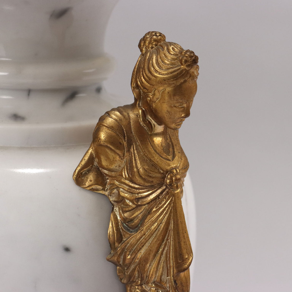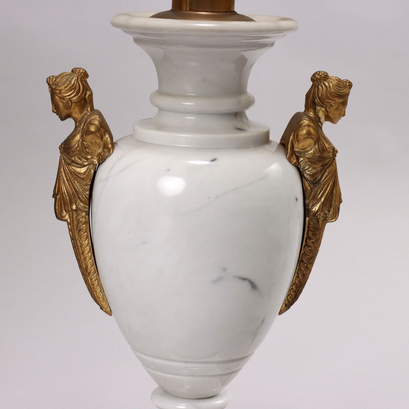 Pair of white marble lamps with gilt bronze base and sockets. The base has a decoration with repeated motifs and the sockets are in the shape of caryatids. Fabric lampshade. 1970s table lamp, 1960s table lamp, table lamp, design table lamp.